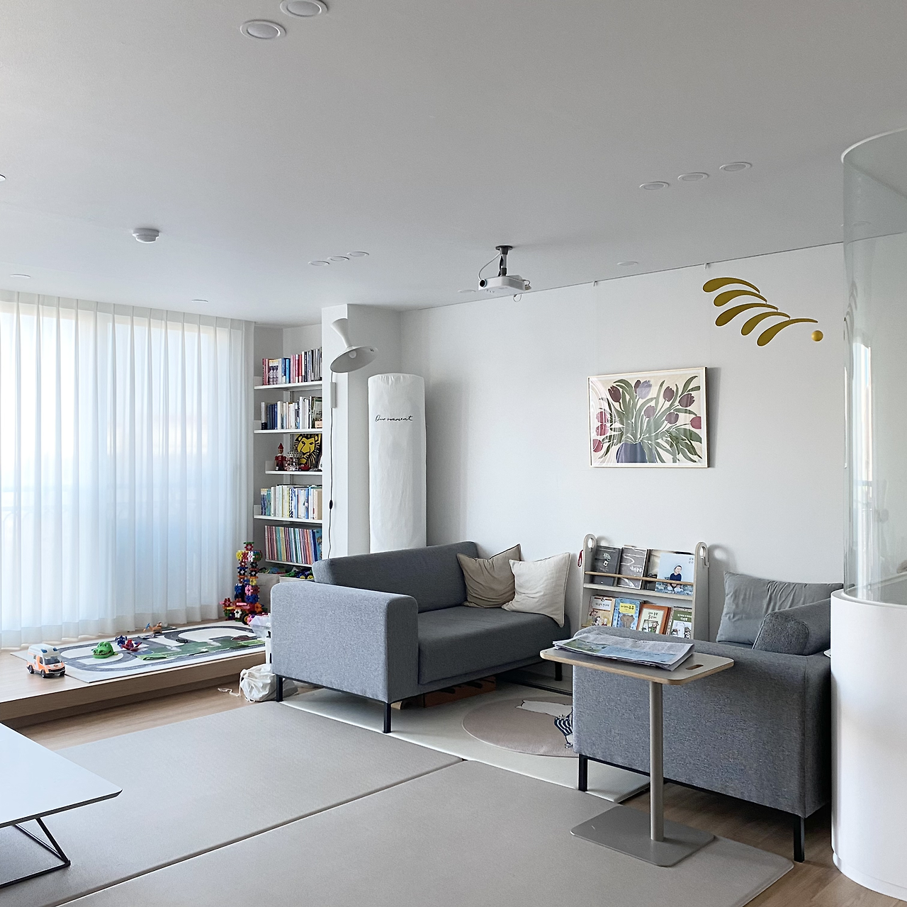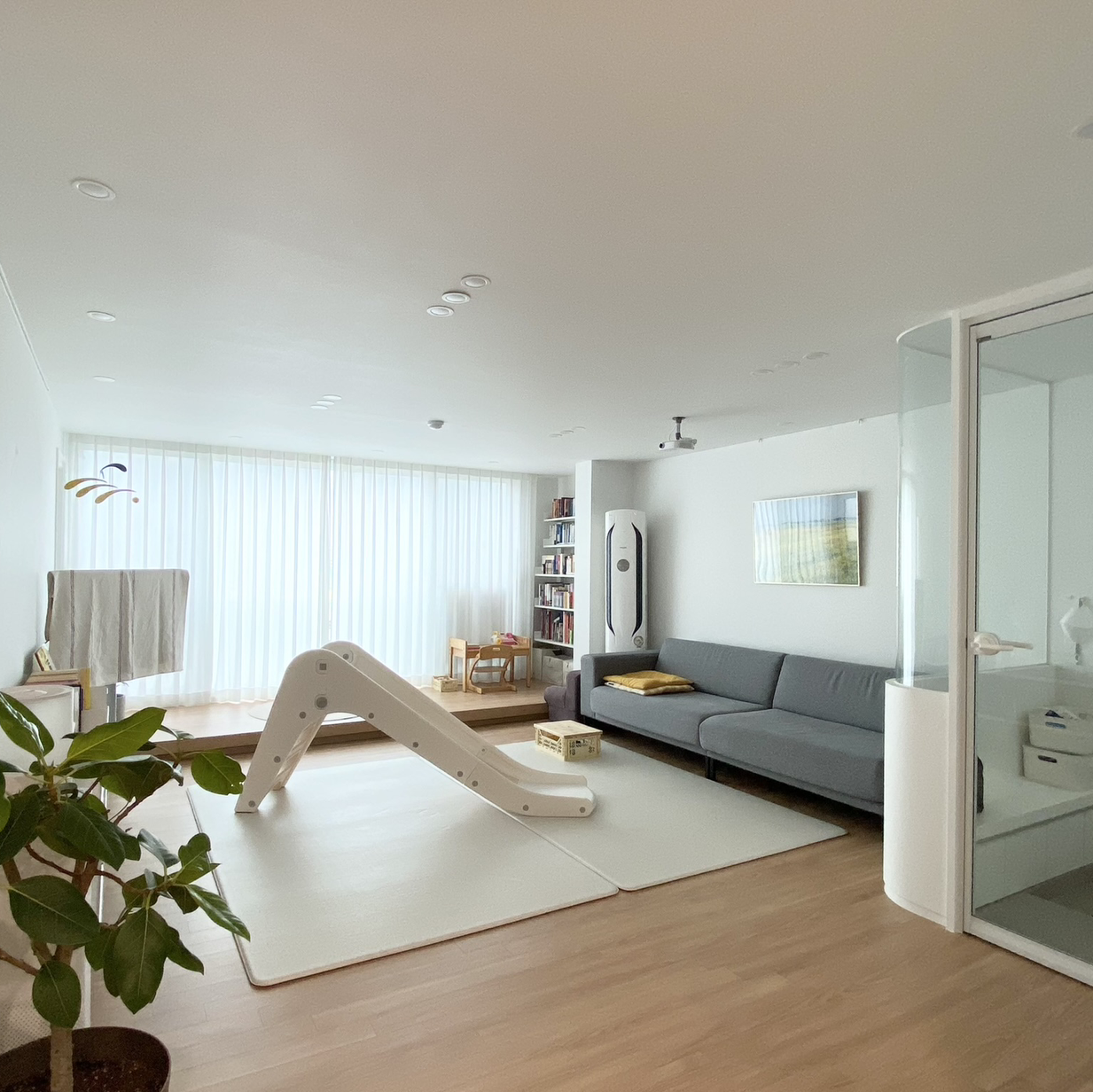 큰 미끄럼틀이 있는 “놀이터 거실”에서, 아이가 크면서 미끄럼틀을 비우고 티비를 안방으로 옮겼어요. 그리고 소파 배치를 바꿔 “책 읽는 거실”로 변화시켰어요.