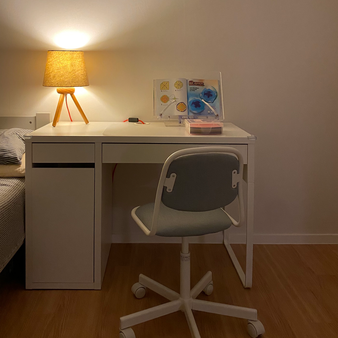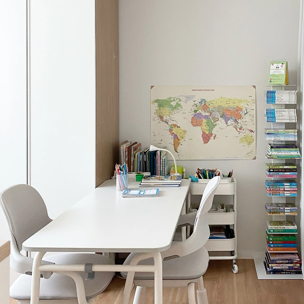 첫째 아이가 초등학교에 들어가며 작은 책상은 비워내고 대면형 수업까지 가능한 책상으로 바꿔주었는데 중고 거래를 통해 부담을 줄일 수 있었어요. 조금 수고스럽지만 필요에 따라 공간을 바꿔주며 효율적인 공간배치를 잘 찾으면 평수가 크지 않아도 편하게 잘 사용할 수 있어요.