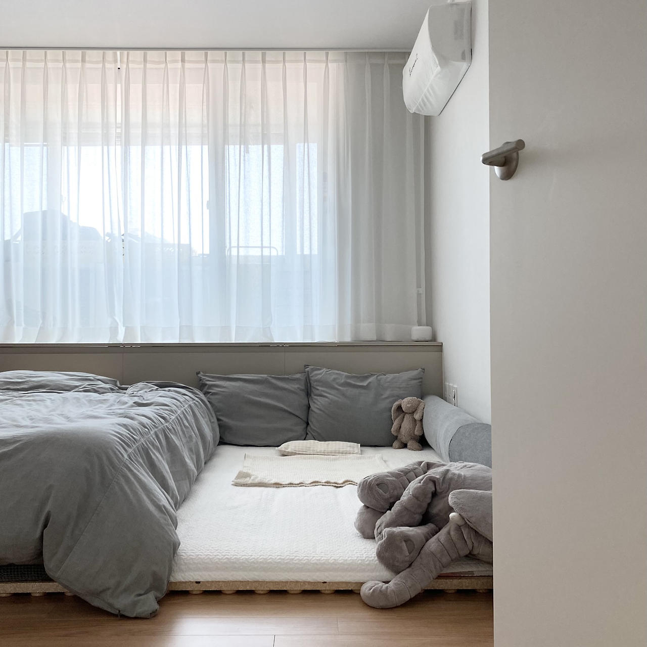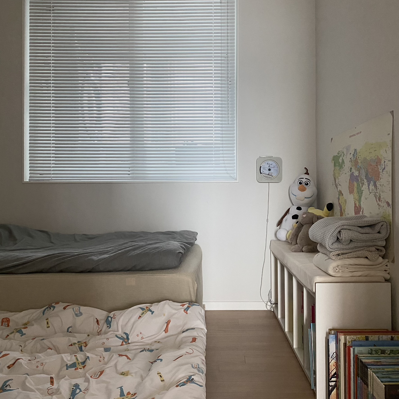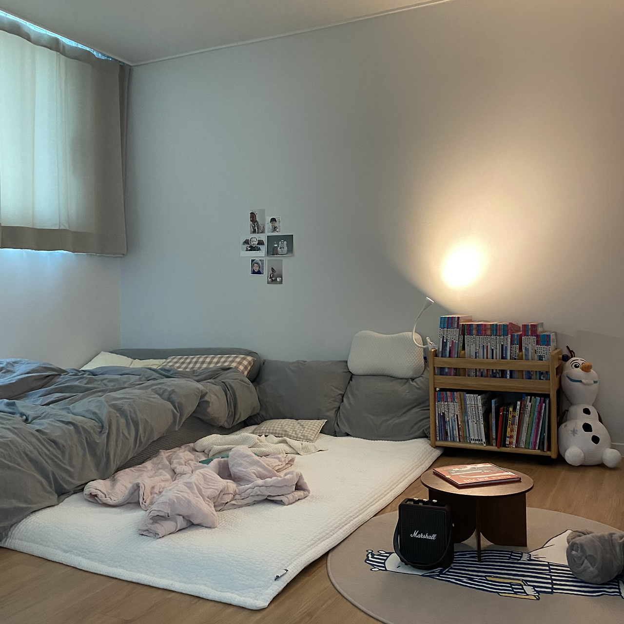 가장 변화가 많았던 작은방 1. 둘째 아이가 베이비시절 엄마아빠와 함께 지낼 때, 첫째 아이 혼자만의 방이었어요. 침대와 작은 책상과 책꽂이 수납장으로 이루어진 방. 둘째 아이가 크면서 잠깐 두 아이의 침실이 되었다가, 침실로 쓰기엔 공간 활용이 아쉬워서 제일 작은방으로 침실을 옮기고, 아이들 공부방이자 놀이공간으로 바뀌었답니다. 아이가 또 자라면 그에 맞게 책상을 하나 더 들이거나 각자의 방으로 분리하거나 등등 변화의 가능성이 가장 많은 공간입니다. 그래서 아이방의 큰 가구인 침대도 프레임 없이 매트리스나 토퍼만을 두었고, 책상도 부담 없는 가구로 두었습니다.