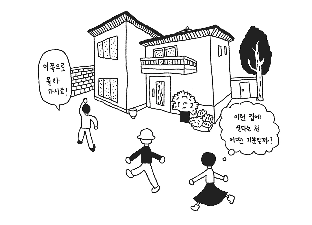 큰길에서 오른쪽으로 한번 꺾어 오르막길을 오르니 곧바로 주택가가 나왔다. 조금 아까 걸어오던 큰길과는 다르게 소박하고 따뜻한 분위기에 마음이 확 누그러졌다. 동네는 2층짜리 주택들과 높아봤자 아담한 빌라들이 모여있어 시야가 확 트여있었다. 덕분에 오르막길 끝으로 남산 전망이 한눈에 들어왔다. 그 중간에 서있는 남산타워는 마치 나만 아는 친밀한 사이 같아 오래도록 눈을 떼기 어려웠다. 다시 시야를 좁혀 주변을 둘러보니 주택 제각기 뽐내는 개성들이 대단하는 게 느껴졌다. 담장 너머 남의 집이라고만 생각했던 이 주택 중 한 곳에 살게 될 수도 있다니, 좀 발칙하다는 생각까지 들었다. 우리가 둘러볼 집이 이 집일까, 저 집일까 설렌 마음으로 골목을 걷다 보니 우릴 향해 인사 하는 부동산 중개인이 보였다. 그리고 그 뒤로 파란 대문이 있었고 그 뒤로는 하얀 벽과 빨간 지붕이 빼꼼 내다보였다.