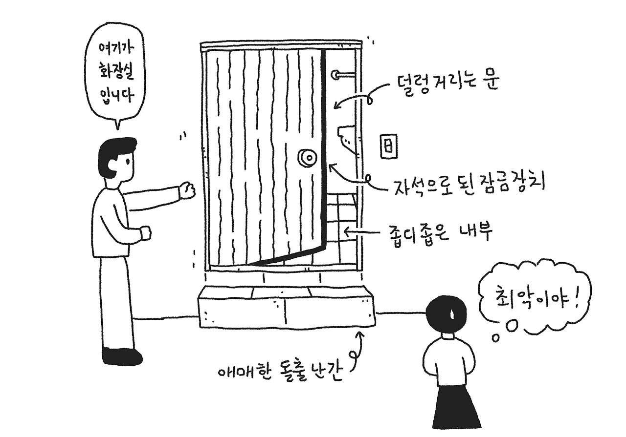 그리고 집의 끄트머리에 이르른 순간 나의 기대감은 와장창 깨지고 말았다. 고풍스러운 나무 프레임과는 극명하게 대비되는 허술한 플라스틱 문짝 하나가 덜렁거리고 있었는데, 중개인이 그쪽을 가리키며 화장실이라고 하는 것 아니겠는가. 좀전에 봤던 거실 창문이 기대감을 잔뜩 부풀려놓은 탓에 초라한 문짝에서 오는 실망감은 배로 큰 충격을 선사했다. 불안한 마음으로 문을 밀자 딸칵하고 경박한 자석 떨어지는 소리가 나면서 플라스틱 문짝이 힘없이 열렸다. 제대로 된 잠금장치가 설치되어 있지 않았을뿐더러 소리, 냄새, 습기 그 무엇 하나 제대로 막지 못할 것 같은 모양새였다. 그 문 뒤에 가려진 협소한 화장실의 상태는 말할 것도 없이 별로였다. 특히 변기와 샤워기 사이의 거리가 너무 가깝다는 게 최악이었다. 매일 아침 이곳에서 샤워하고 출근하는 내 모습을 상상만 해도 눈물이 핑 돌 것 같이 서러워졌다. 아니지, 이건 아니지! 나는 꿈의 창문 뷰 같은 건 깡그리 잊은 채 중개인에게 생각을 좀 더 해보고 연락해주겠다고 말한 뒤 성큼성큼 집에서 빠져나왔다.