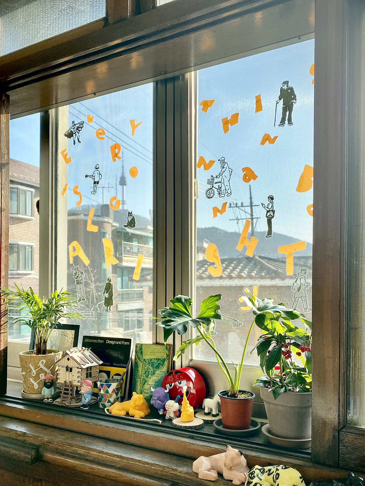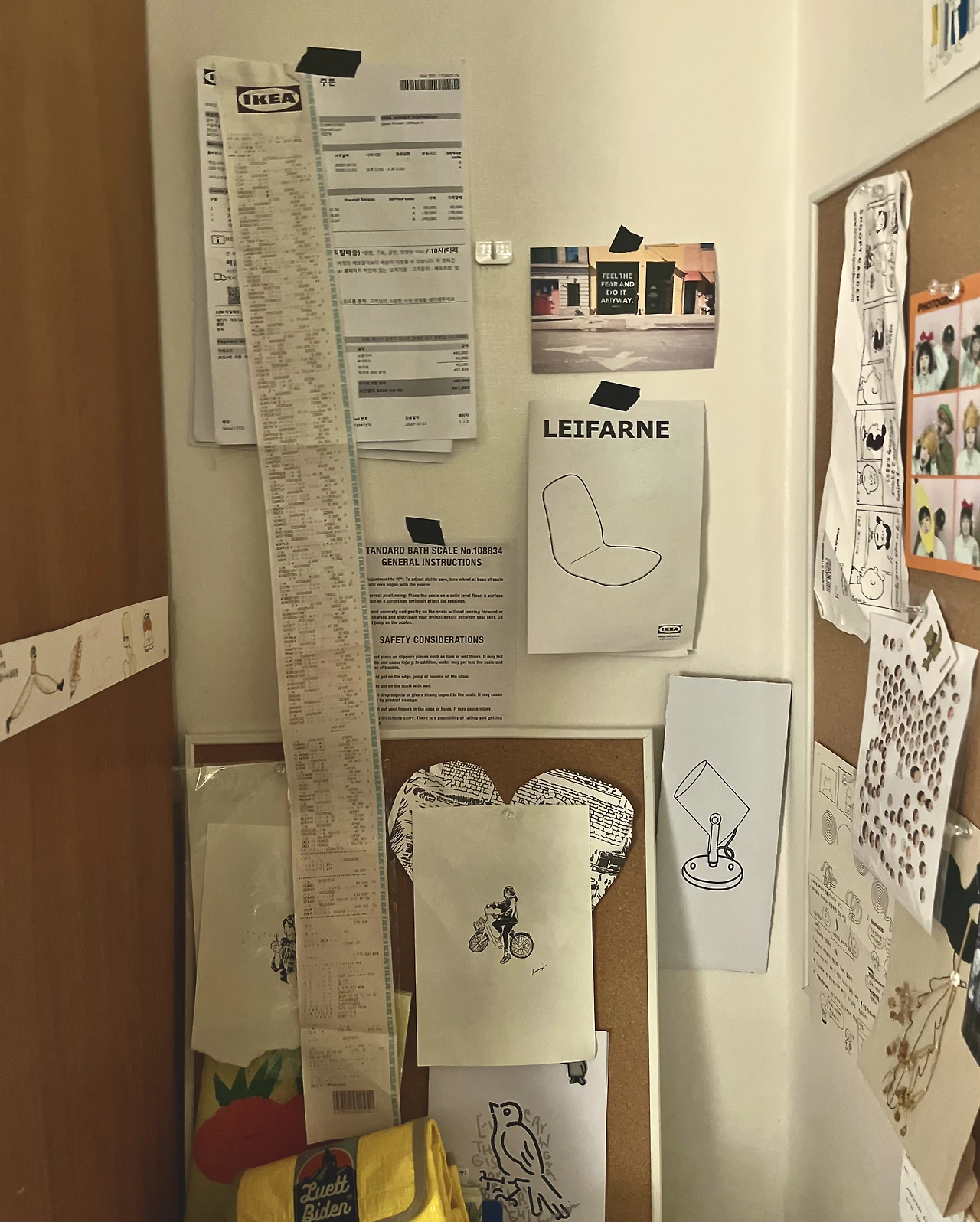 액자와 그림만 벽에 붙이란 법은 없다. 스티커, 사진, 엽서, 마른 꽃, 전시티켓, 책 표지, 영수증까지 벽에 붙을 정도로 가볍기만 하다면 벽에 붙어있을 자격은 충분하다. 우린 그렇게 생각한다. 귀엽고 예쁜 것은 드러내놓고 자주 보아야 한다고. 서랍이나 파일 속에 고이 모셔두다 잊혀지기엔 찌라시들이 담고있는 아름다움이 너무 아깝다. 보아야 잊혀지지 않는다. 집에 사는 한 사람은 끊임없이 글을 메모하고, 다른 한 사람은 끊임없이 그림을 그리니 거실은 그야말로 사면초가다. 하지만 신기하게도 공간은 만들면 생긴다. 그것을 옹기종기의 마법이라 부르겠다. 그리고 자고 일어나면 간간이 책상 위에 올려져있는 설쌤의 그림 선물은 어딘가 전시해두지 않고는 못 배기겠다. 설쌤의 손에서 검정 라인으로 다시 태어난 내 모습들이 여기저기서 빛을 발했으면 좋겠다.