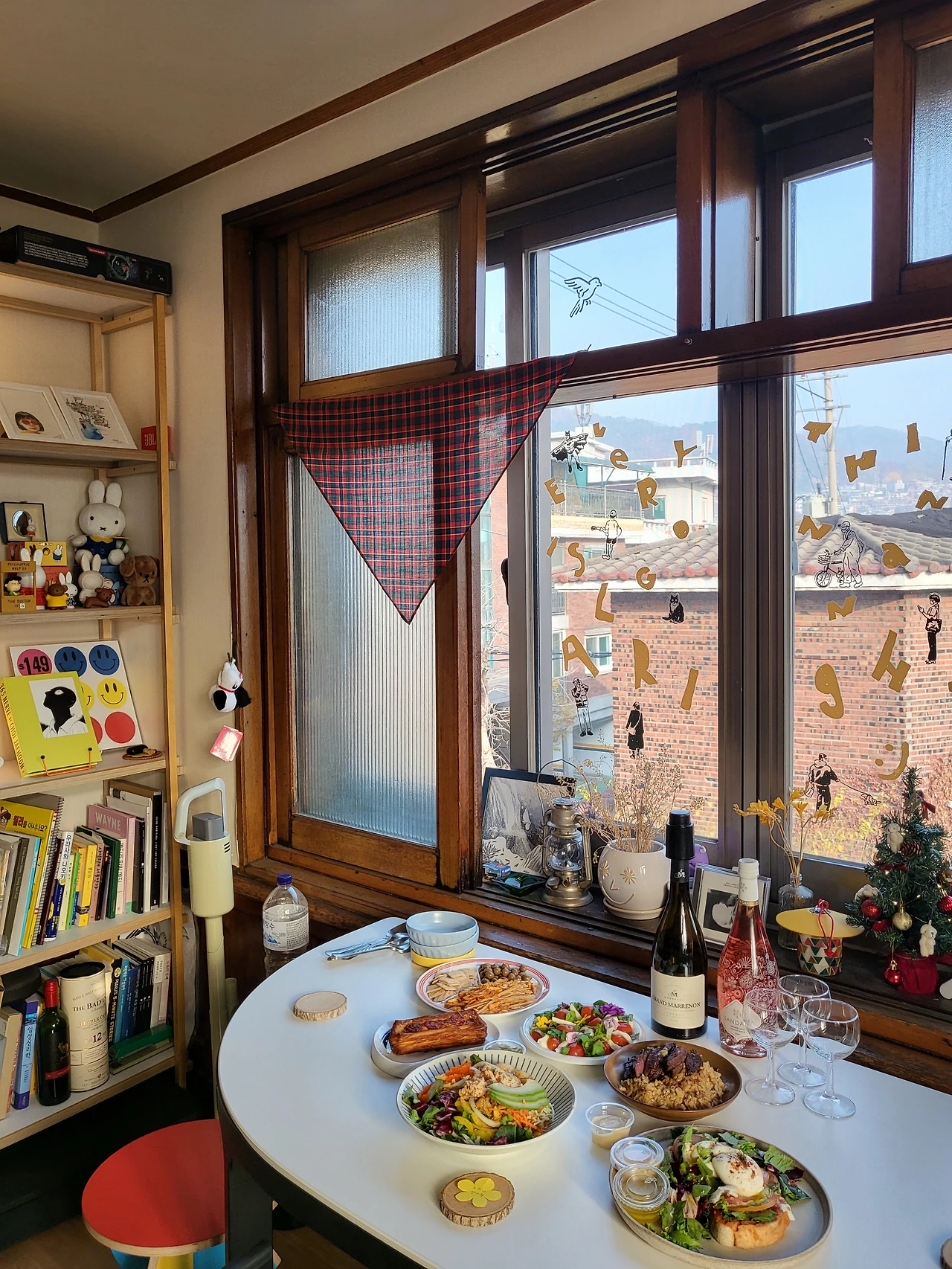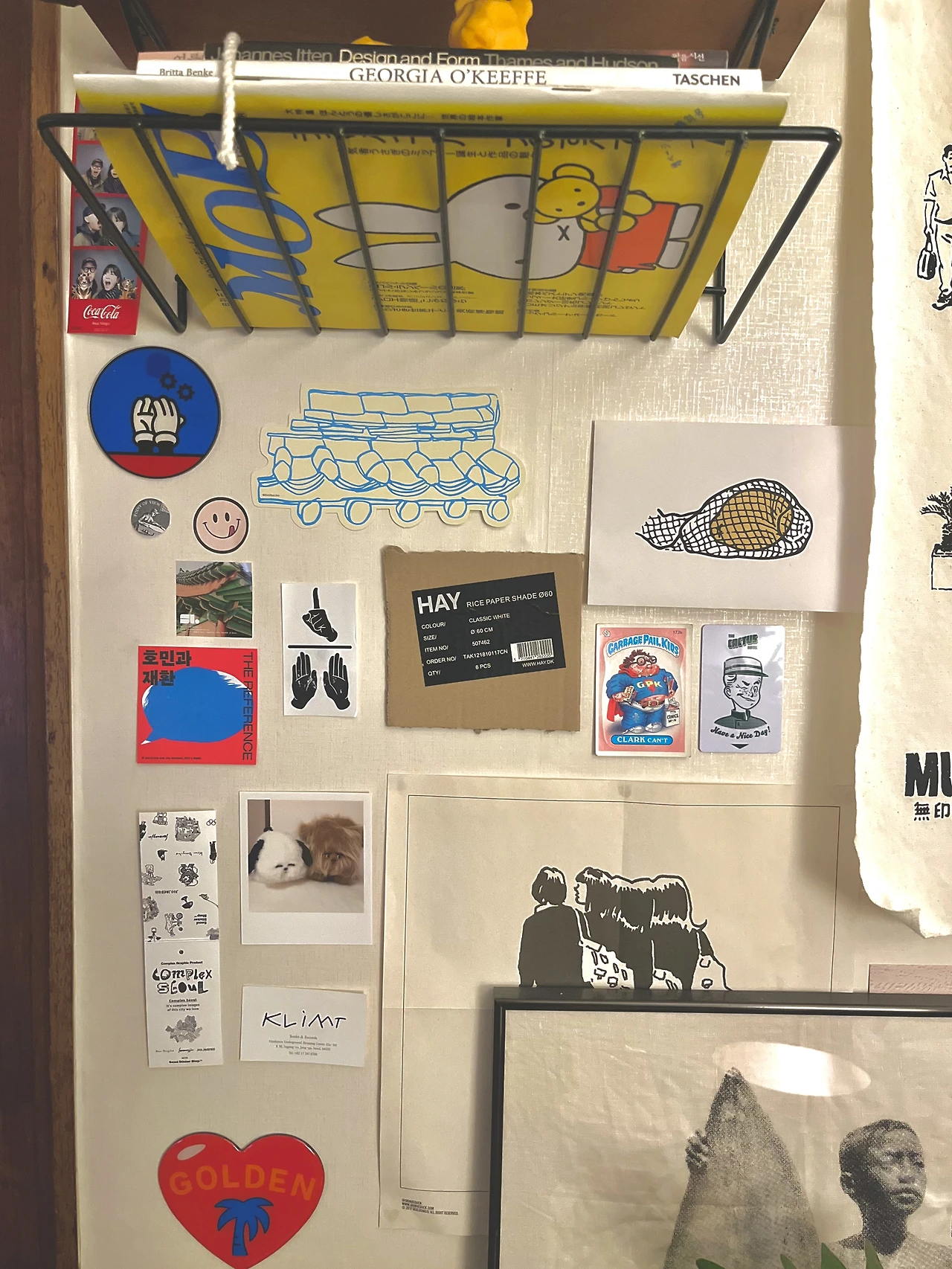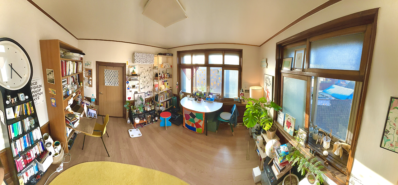 그렇다. 그 맥시멀리스트가 바로 나와 설쌤이다. 사귀기 전부터 서로가 맥시멀리스트라는 걸 알고있었고 어쩌면 그런 특징이 매력으로 다가와 서로에게 끌렸던 걸지도 모르겠다. 용도와 상관없이 사물의 아름다움을 발견할 줄 아는 눈은 특별하다. 그리고 마음을 쏟은 물건을 쉽게 버리지 못하는 습성에는 다정함이 묻어있다. 특별한 눈과 다정한 마음을 가진 사람과 나누는 사랑은 또 얼마나 소중한 경험이겠는가. 너무나 감사하게도 우리는 반달집이라는 터를 찾아 그 소중한 경험을 차곡차곡 쌓아나가고 있다. 물론 처음부터 이렇게 물건 더미의 방을 만들자고 계획했던 것은 아니다. 내가 방 꾸미기 계획서를 설쌤에게 들이밀었을 때, “히에에엑”하며 놀라던 설쌤의 반응을 잊을 수 없다. 그리고 “집을 꾸미는 일은 재밌는 놀이가 되어야하는데 이렇게 숙제처럼 하고 싶지 않아.”라는 설쌤의 말이 나를 열어놓았다. 계획은 접어두고 재밌게 집을 꾸미기로 마음먹었다. 마음 이끄는 대로 벽지를 채우고 소품을 쌓고 가구를 들이다보니 어느새 우리의 얼굴보다도 더 선명하게 우릴 보여주고 있는 거실의 면면들을 소개해보고자 한다.