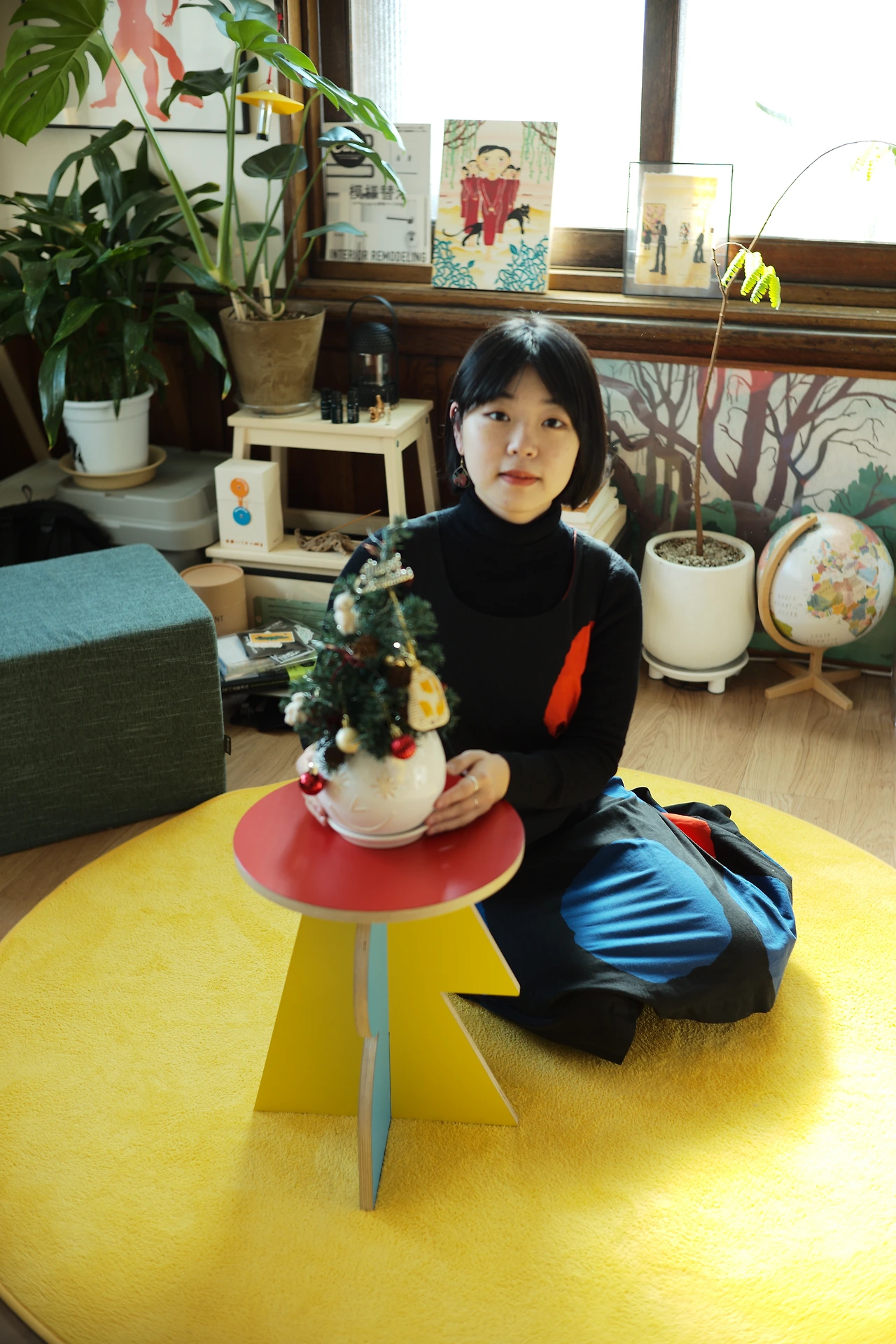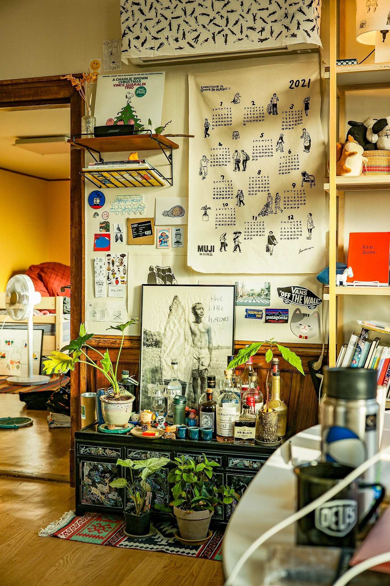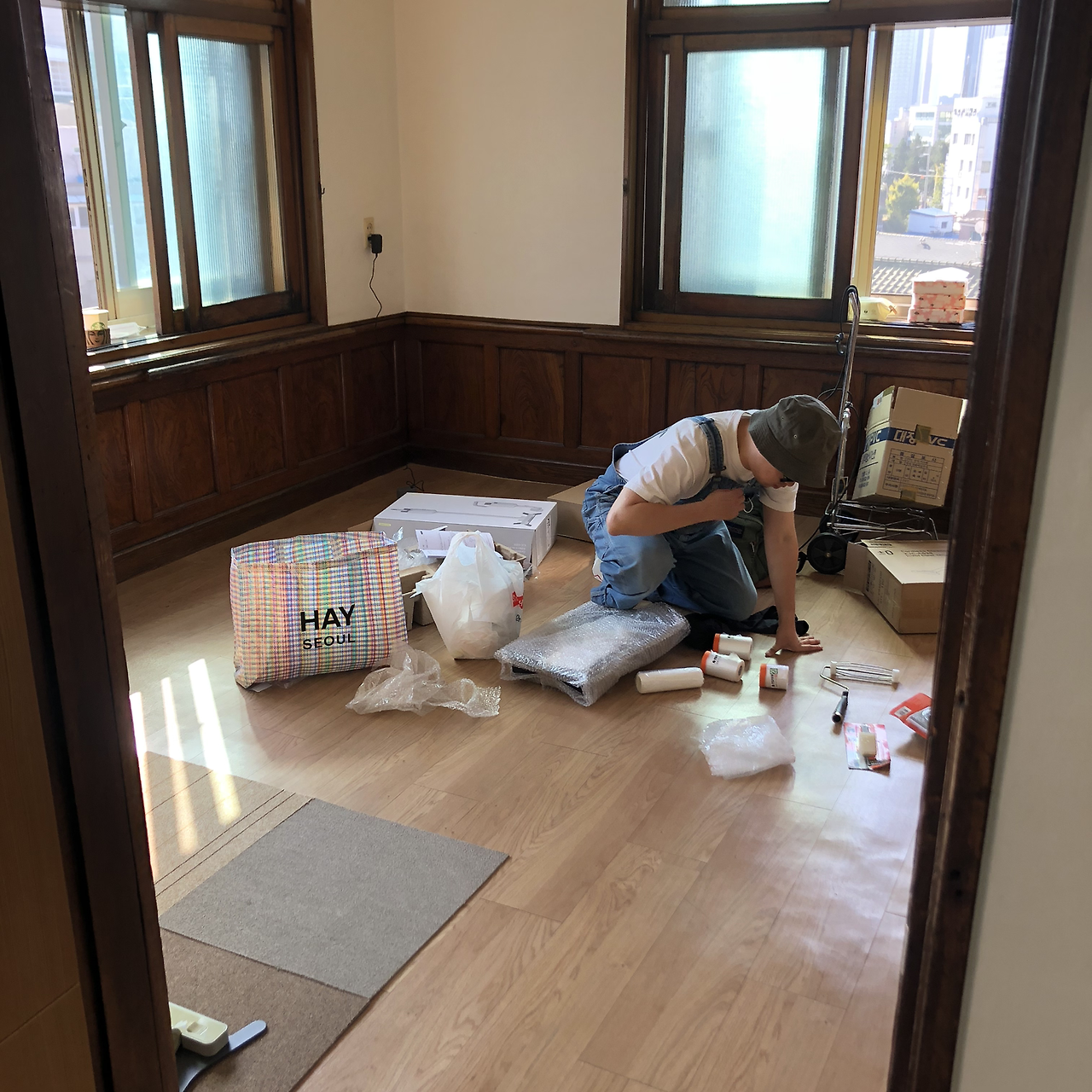 그렇다. 그 맥시멀리스트가 바로 나와 설쌤이다. 사귀기 전부터 서로가 맥시멀리스트라는 걸 알고있었고 어쩌면 그런 특징이 매력으로 다가와 서로에게 끌렸던 걸지도 모르겠다. 용도와 상관없이 사물의 아름다움을 발견할 줄 아는 눈은 특별하다. 그리고 마음을 쏟은 물건을 쉽게 버리지 못하는 습성에는 다정함이 묻어있다. 특별한 눈과 다정한 마음을 가진 사람과 나누는 사랑은 또 얼마나 소중한 경험이겠는가. 너무나 감사하게도 우리는 반달집이라는 터를 찾아 그 소중한 경험을 차곡차곡 쌓아나가고 있다. 물론 처음부터 이렇게 물건 더미의 방을 만들자고 계획했던 것은 아니다. 내가 방 꾸미기 계획서를 설쌤에게 들이밀었을 때, “히에에엑”하며 놀라던 설쌤의 반응을 잊을 수 없다. 그리고 “집을 꾸미는 일은 재밌는 놀이가 되어야하는데 이렇게 숙제처럼 하고 싶지 않아.”라는 설쌤의 말이 나를 열어놓았다. 계획은 접어두고 재밌게 집을 꾸미기로 마음먹었다. 마음 이끄는 대로 벽지를 채우고 소품을 쌓고 가구를 들이다보니 어느새 우리의 얼굴보다도 더 선명하게 우릴 보여주고 있는 거실의 면면들을 소개해보고자 한다.