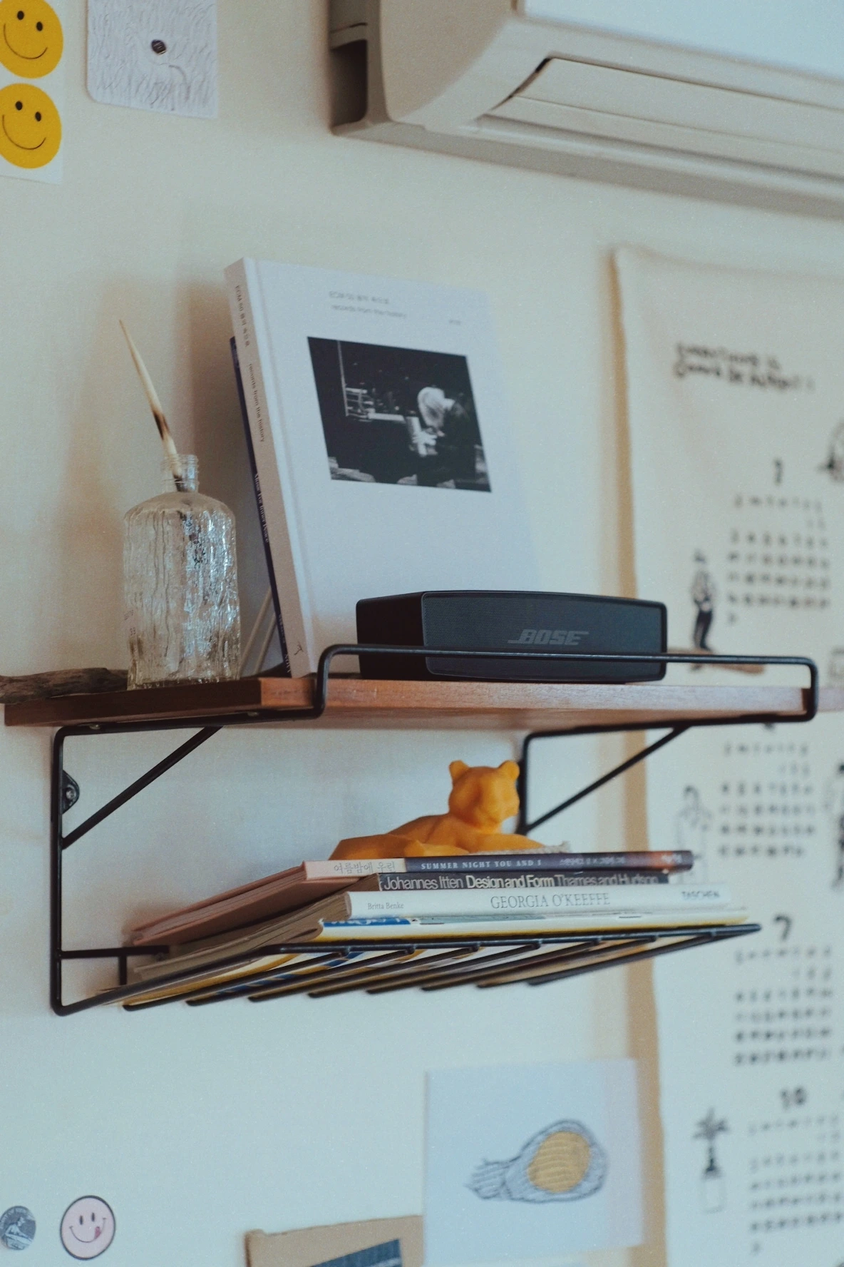 맥시멀리스트란 결국 상상력이 풍부한 사람 아닐까? 물건의 용도를 넘어 그 뒤로 펼쳐지는 에피소드와 물건이 자아내는 분위기를 상상하다보면 도무지 버릴 수 없는 물건과 사지 않을 수 없는 물건들이 차고 넘쳐 나게 되는 법이니까. 제주도까지 가서 음악선반을 구해다 온 경위도 그런 논리에 위배되지 않는다. 여행 중 우연히 들른 빈티지 가게에서 설쌤이 요상하게 생긴 나무 판자를 위로 아래로 몇번을 뒤집어보며 의아해하고 있는 것 아니겠는가. 나까지 거들어 헷갈려 하고 있자, 가게 주인이 다가와 판자의 올바른 모양새와 용도를 알려주었다. 나무 판자 아래에 달린 철제 받침이 살짝 사선으로 올라간 빈티지 벽걸이 선반이었다. 설쌤과 나는 선반을 함께 쥐고 상상의 나래를 펼치기 시작했다. 술상 위에 이걸 거는 거야, 거기에 스피커랑 음악 추천 서적들을 얹는거지, 모닝 커피를 마실 때 여기서 노래가 흘러나온다고 상상해봐, 아니지 밤에 술 마시다가 여기서 음악을 선별해서 bgm을 트는 거지. 우린 그대로 눈이 맞아버렸고 제주도에서부터 4키로는 족히 넘는 선반을 이고지고 상경했다. 훗날 가게 주인 분이 우리에게 보낸 메시지엔 이렇게 적혀 있었다. “집과 잘 어울려요. 눈이 보배이십니다.”