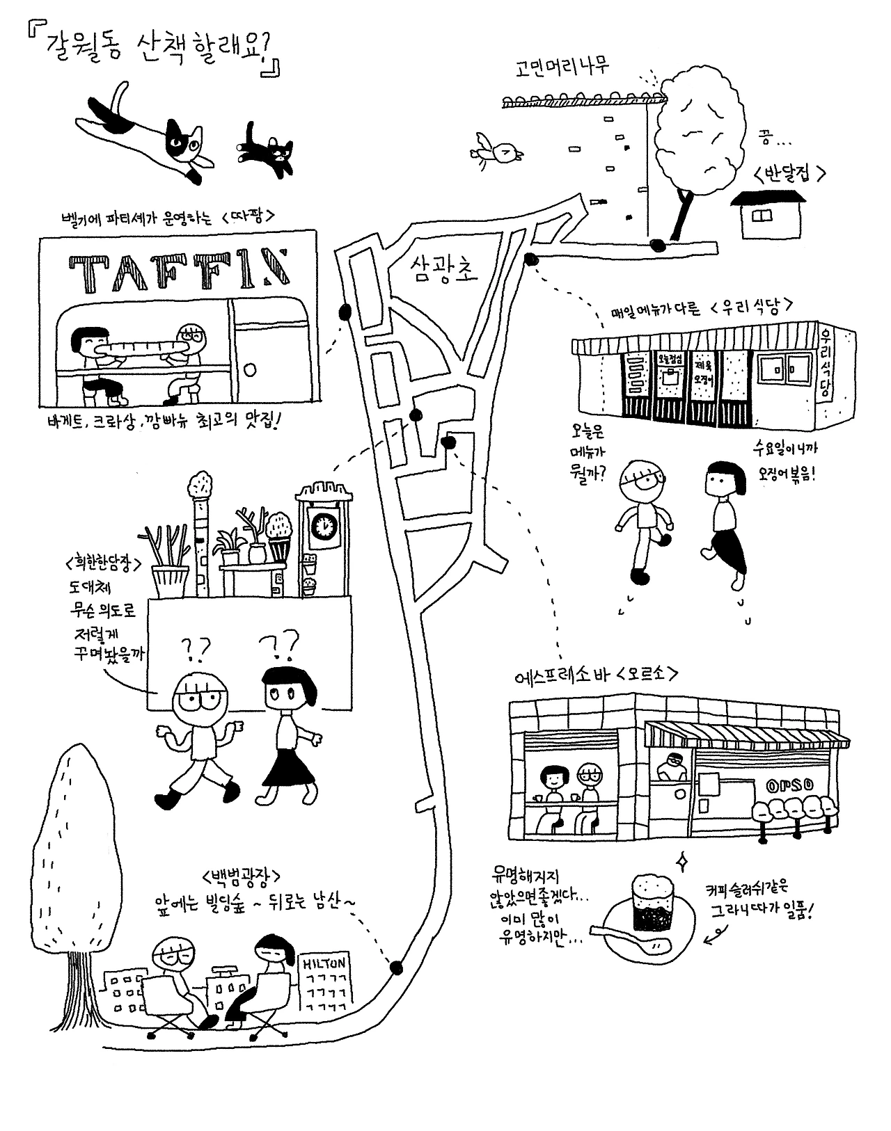 반달집 창문 앞에 서면 앞집 옥상에 널린 빨래부터 해방촌 언덕 꼭대기에 있는 교회 장식 등까지 훤히 다 보인다. 날씨 좋은 날엔 남산을 이루고 있는 나무 한 그루 한 그루의 싱싱함이 눈에 다 담길 정도다. 우뚝 선 남산 타워가 “이리 와라. 얼른 와봐라.” 하고 유혹하는 것만 같다. 그렇게 창밖을 보고 있노라면 얼른 저 풍경을 정복하고 말겠다는 마음이 이글거려 결국 신발끈 조여매고 밖을 나돌아 다니기 일쑤다. 워낙 집에 붙박여 있는 성격이 아닌 나와 설쌤은 걸음걸음 발자취로 동네 사랑을 몸소 실천하는 편이다.