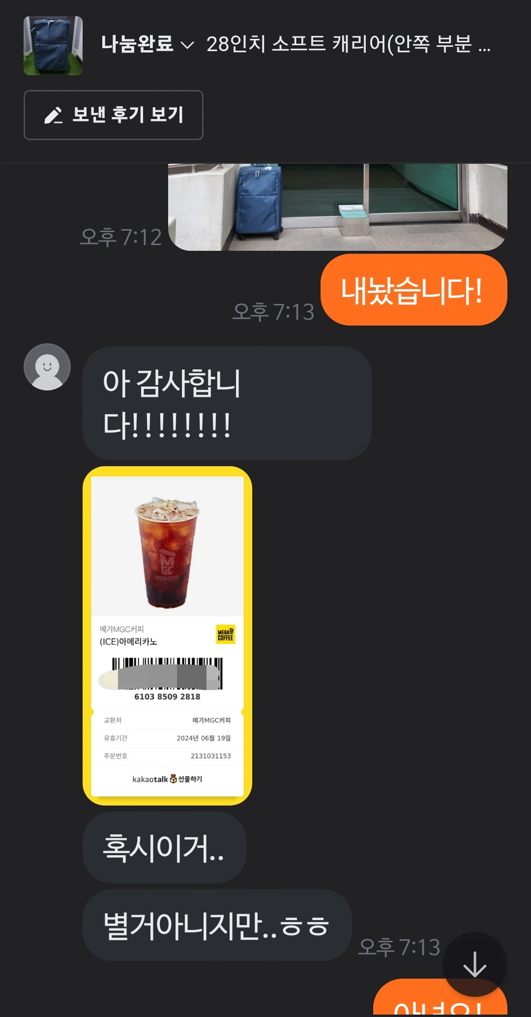 여행용 캐리어를 가져가신 분은 감사하게도 아이스아메리카노 쿠폰을 보내주었다.