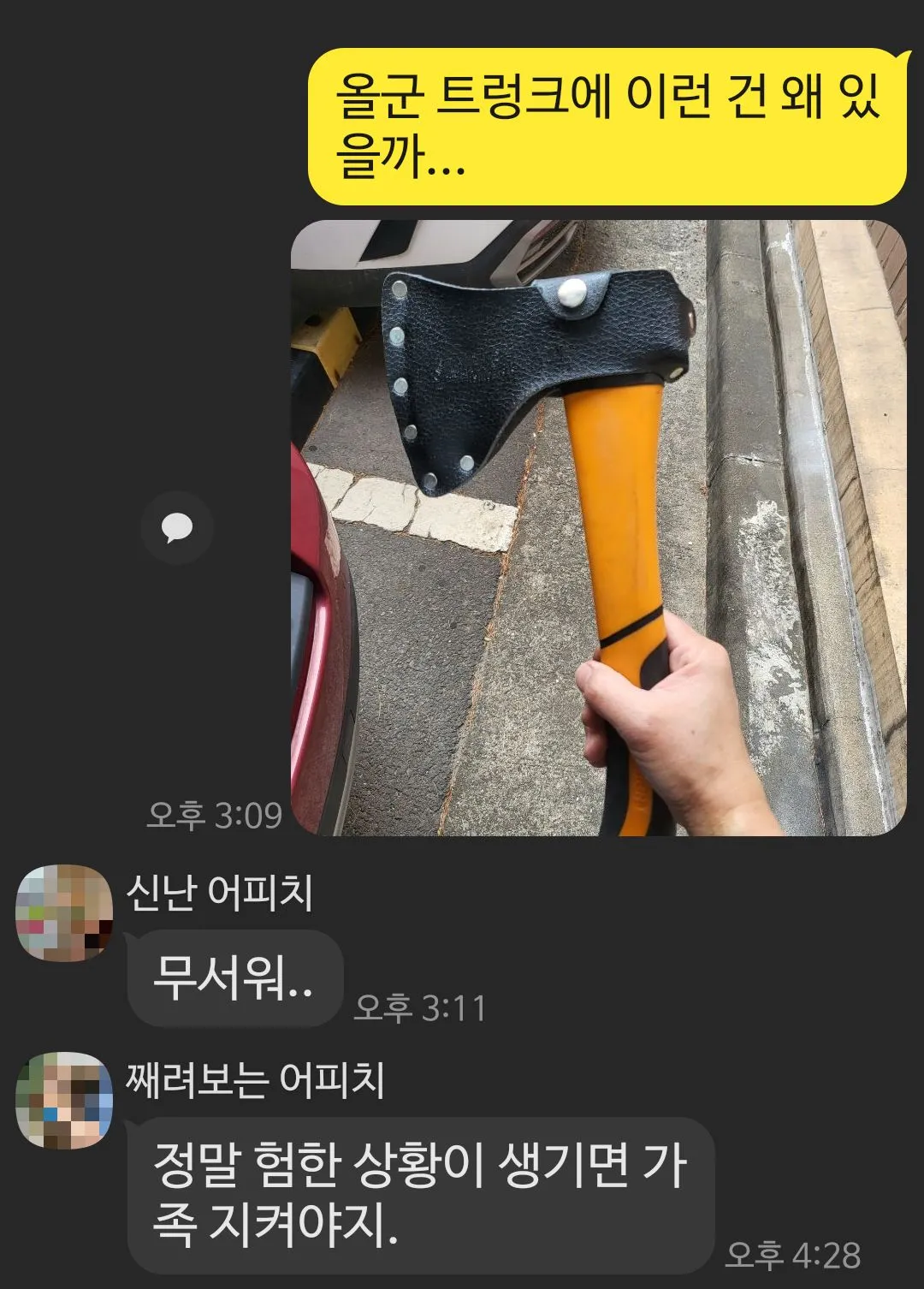 갑자기 손도끼가 나와서 깜짝 놀랐다. 가족톡에 물어보니 남편이 비상 상황에 대비해 둔 거라고 한다.