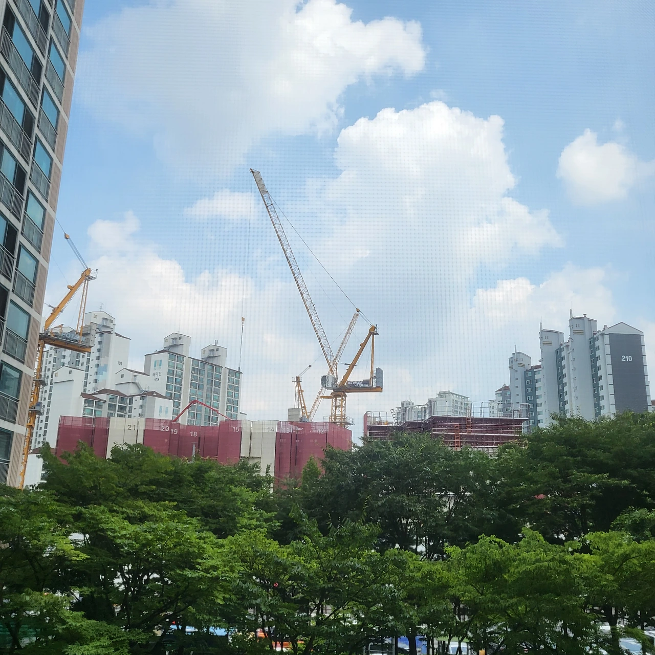 우리 집 주변은 다 공사 중이다. 발코니 맞은편은 2년 후가 완공인 아파트 재건축 중이라 하루하루 건물의 높이가 올라간다. 원래는 우리 아파트 밖이 지역 재개발로 텅 비어 있었고 우리 집은 수령이 많은 나무들로 둘러싼 '놀이터 뷰'였는데 지금은 '재건축 뷰'가 돼 버렸다. 오르내리는 육중한 철강 재료들 소리, 콘크리트 같은 것을 붓는 소리가 들린다. 집 뒤쪽으로도 길 건너에 지식산업센터를 짓고 있다.