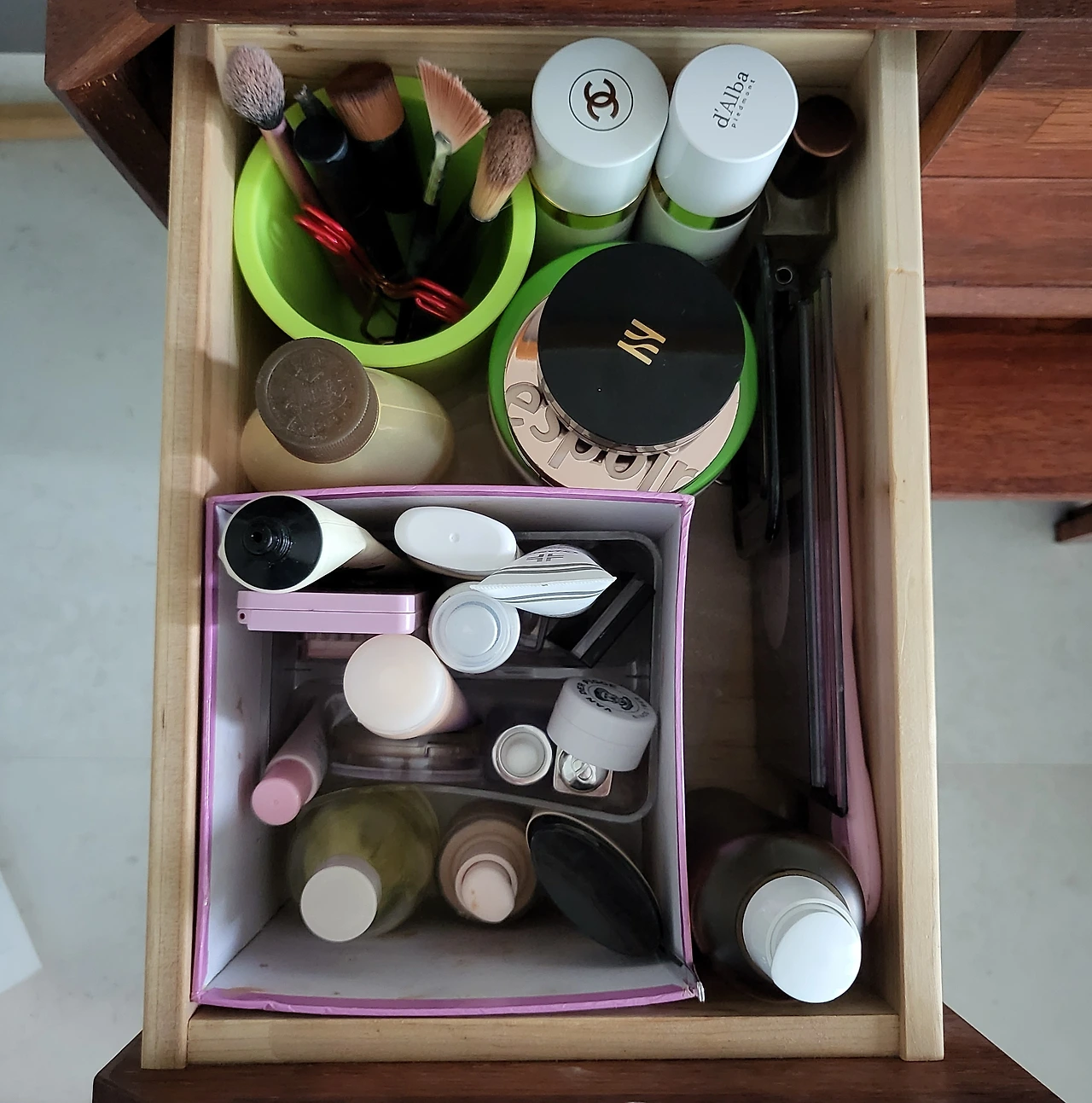 아무것도 없는 화장대 위와 인구밀도 높은 화장대 서랍