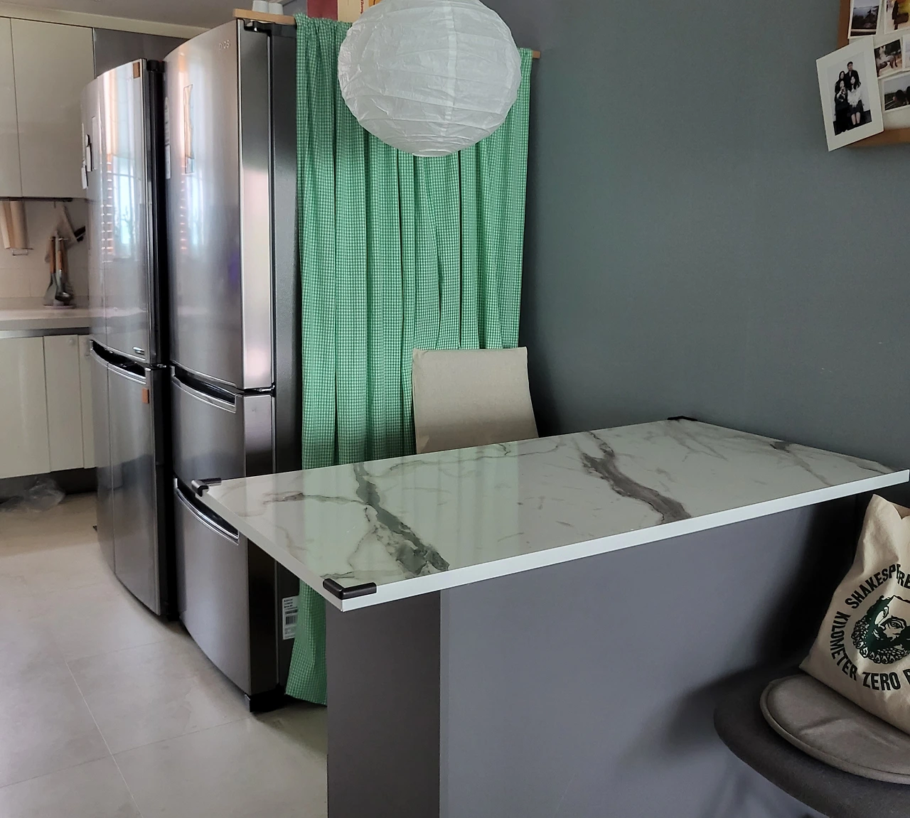 보조 식탁이든 메인 식탁이든 이것저것 올려놓기 딱 좋다. 그러나 뭔가가 올려진 모습과 아무것도 없이 깨끗한 모습은 천지차이다. 식탁에서 볼일을 마치면 싹 치운다.