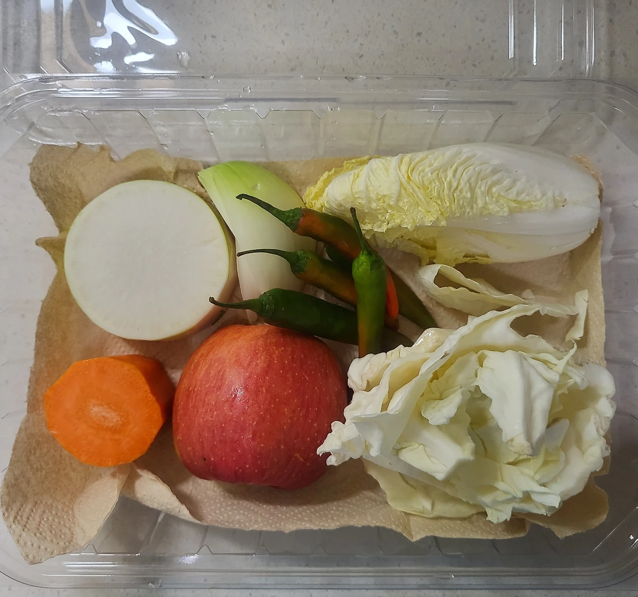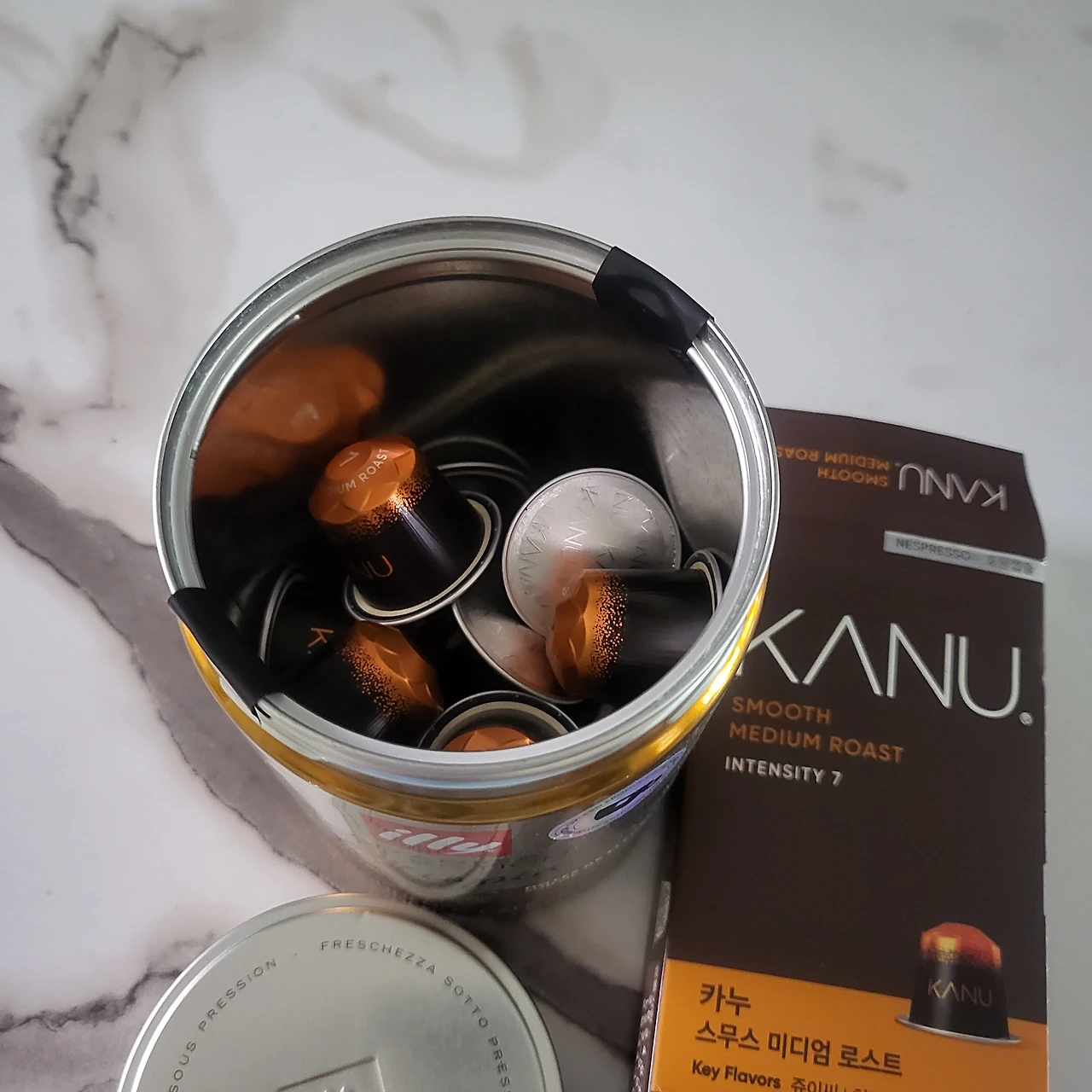 커피 캡슐이 들어있던 틴케이스는 그대로 캡슐 보관통으로 쓴다. 버리기 아까운 샐러드 용기는 몽당 채소를 모아 냉장고 서랍 안에 두고 더 활용한다.