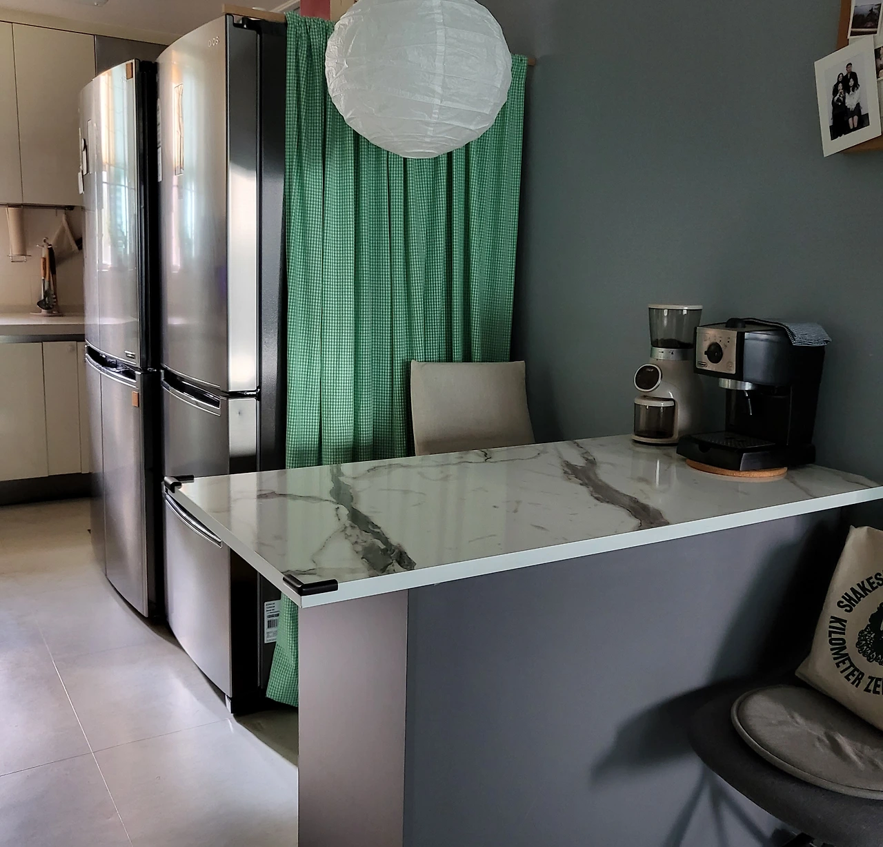 아일랜드 식탁 위에 원두 그라인더와 커피 머신이 있고 없고의 차이