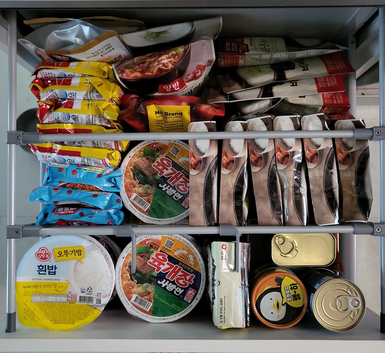 실온보관 식료품은 주방 키큰장 맨 아랫서랍 하나를 정하고 거기 들어갈 만큼만 채우니 돈과 물자 낭비가 적다. 유통기한이 긴 통조림이라도 그 서랍 안에 누울 자리가 없으면 더 사지 않는다.