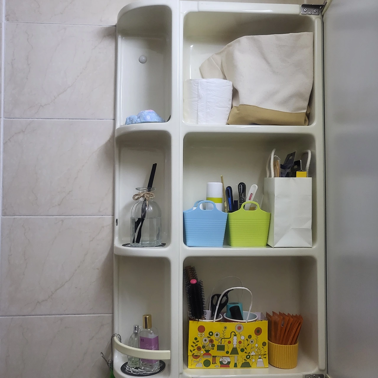 거실 욕실 수납장은 작은 욕실보다는 좀 크지만거울이 문에 붙은 여닫이 방식이라 요즘 스타일의 수납장보다 수납력과 모양면에서 떨어진다. 그래도 아직 튼튼하다.
