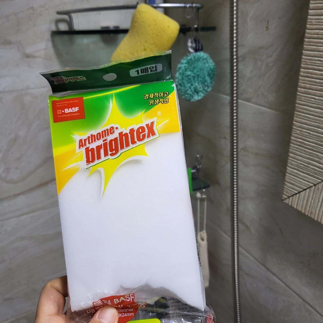 오래된 욕실 청소에는 매직블록이 필수다. 매직블록은 연마 방식으로 오염을 제거하므로 스크레치를 낼 수 있어서 새 집 살림에는 쓰지 않는 게 좋다. 대신 오래된 욕실 청소에는 특화돼 있다. 욕조, 수전, 거울까지 닦아 광택을 내는 데에 어느 세제보다 가성비와 가심비가 높다.