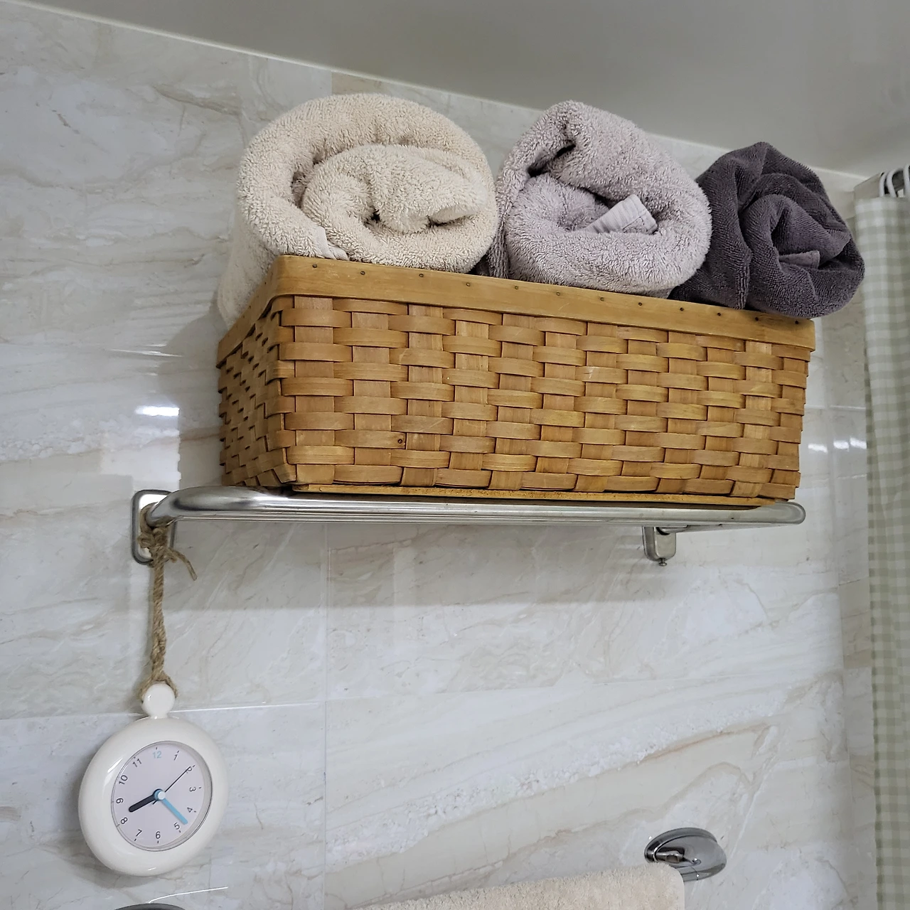 우리 가족은 큰 목욕 수건을 좋아한다. 샤워 후에 목욕 수건은 꺼내 쓰기 좋게 위쪽 선반에 따로 담아 두었다. 욕실용 방수 시계도 모던하우스에서 산 지 20년은 넘은 듯한데 여전히 고장 없이 잘 간다.