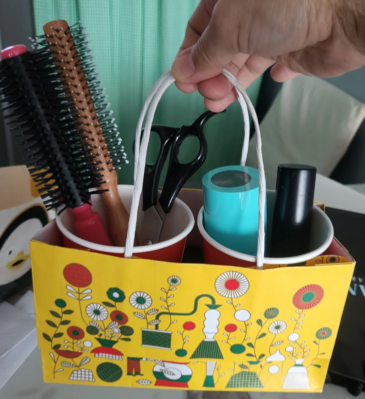 무엇을 얼마나 자주 쓰는지 몰라서 맘대로 버릴 수는 없다. 하나씩 꺼내 쓰는 리필 면도날이나 치간칫솔은 작은 쇼핑백에다 포장채 넣어 수납장 구석에 세워 두었다. 마침 크기도 맞고 두꺼워서 그 용도에 딱 좋은 종이백이있었다