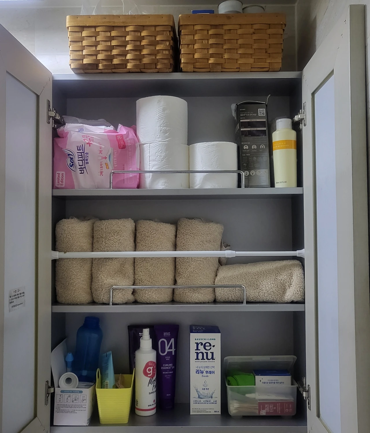 가운데 칸은 수건을 두는데 미니 압축봉을 질러 놓으니 수건을 넣고 꺼낼 때 굴러 떨어지지 않아 좋다.