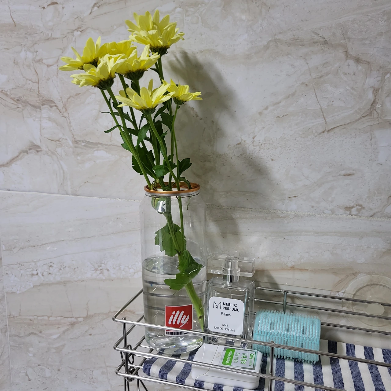 문을 닫아도 밖으로 노출되는 바깥 부분에는 디퓨저와 화장실 에티켓용 향수병을 놓았다. 맨 위쪽에 있는 건 입욕제인데 예쁜 입욕제를 욕실에 놔둔 선배 언니를 따라 했다. 입욕제 자체도 연한 향기가 나지만 가루를 굳힌 재질이라 생각날 때마다 향수를 뿌려 두면 향이 지속되는 장점도 있다.