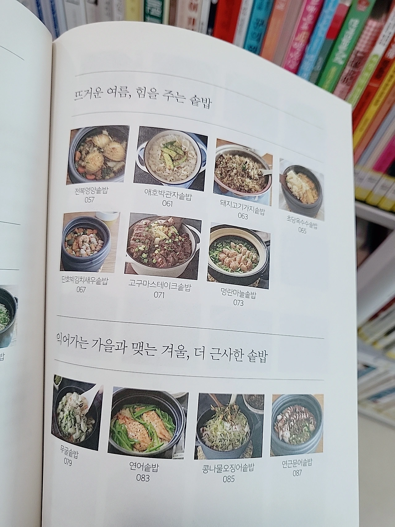 책을 펼친 채 머릿속으로 인터넷 검색창과 비교하다가 그만, 책장에 있는 돼지고기가지솥밥의 사진을 손가락으로 꾹 눌러버렸다. 본 사람이 없나 두리번거렸다. 다행이다.