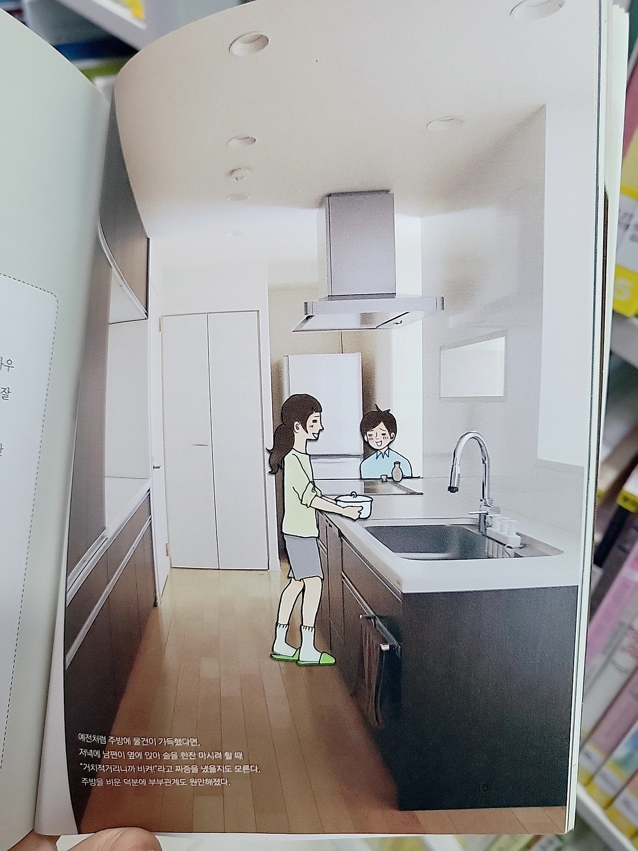 아무것도 없는 집에서 살아서 좋다는 내용의 책을 넘겨보다가 주방 사진을 보았다. 예전에 내 살림과 생활이 복잡할 때는 이런 모습이 좋아 보였는데 요즘은 너무 살림 냄새가 안 나는 집은 그냥 보고 넘기게 된다. 사람이 사는 집이라면, 오늘 아침에 사람이 머물렀구나 하는 흔적 정도는 있는 게 좋다고나 할까. 사람의 흔적은 많아도 문제, 없어도 문제인가 보다.
