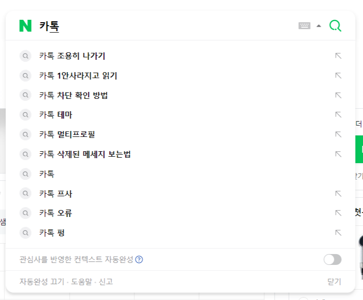 네이버 검색창에 '카톡'이라 치면 '카톡 조용히 나가기'가 예상검색어로 가장 먼저 뜬다는 사실을 발견했다. 그만큼 많은 사람들이 카톡방에서 조용히 나가는 방법을 찾는다는 것인가.