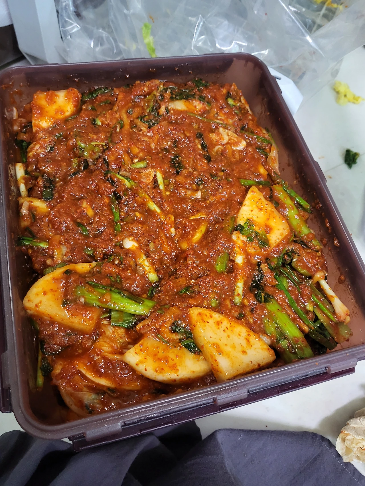 우리는 김장 독립 원년부터 온라인 마켓에서 절임배추 20킬로와 김치양념 10킬로로 구성된 4인가족김장패키지를 구입해서 김장을 한다. 맛 고민이 없게 스탠다드한 대기업 김치양념을 베이스로 하고 거기다가 재료들을 더 넣는다.