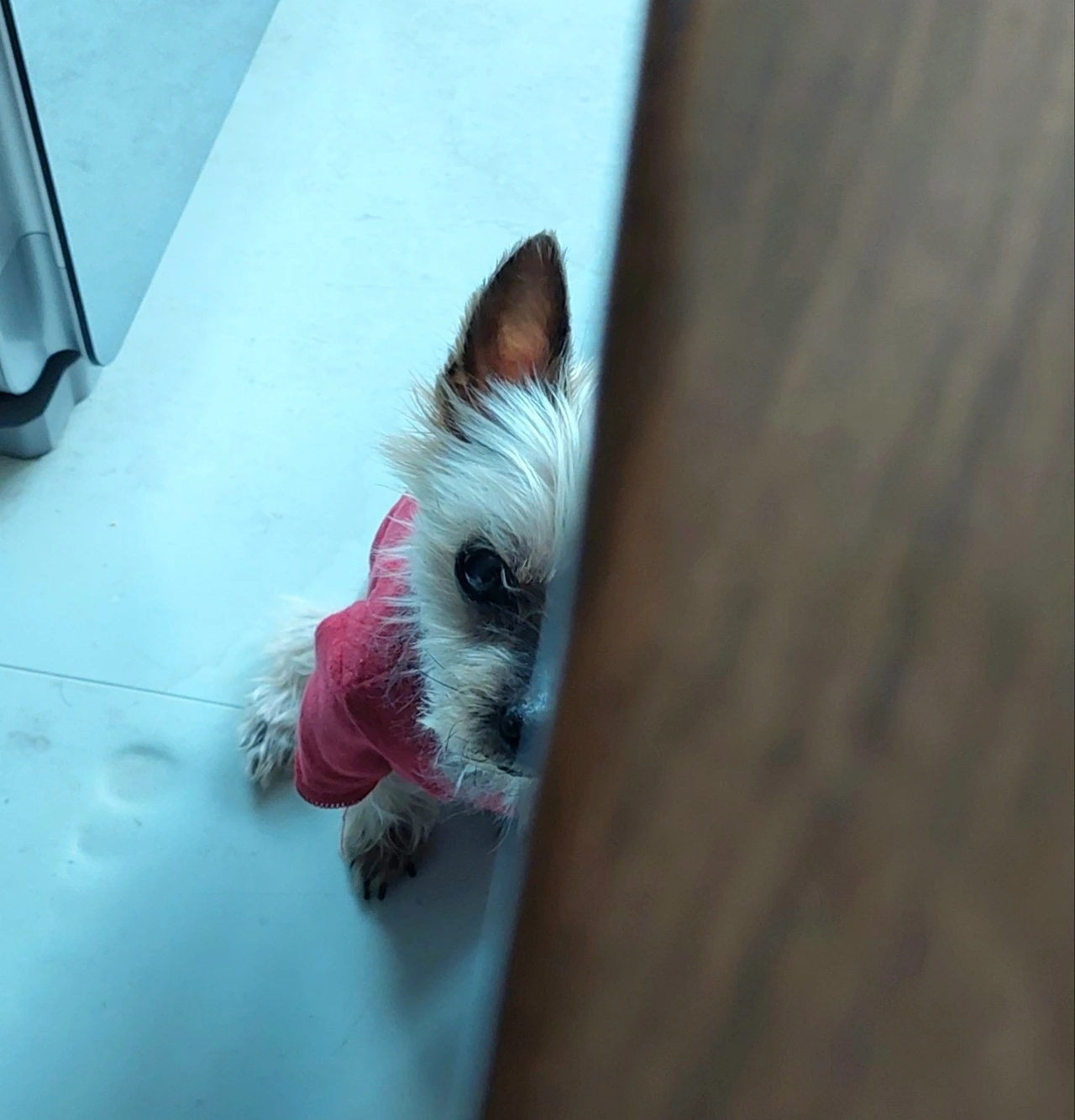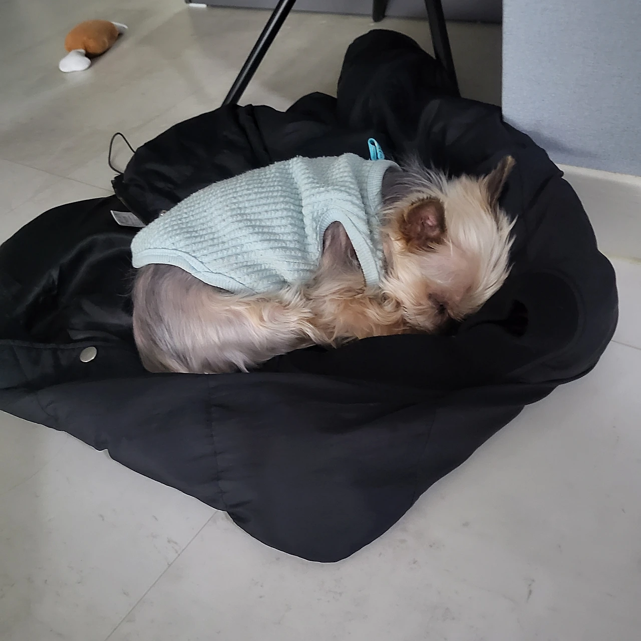한번은 내가 친구들과 만나 점심 먹고 놀다 들어왔더니 개가 자기 집과 방석을 다 놔두고, 내가 입고 나가려다 벗어 놓은 패딩 위에서 잠들어 있었다. 머리는 현관을 향한 채로 고개만 들면 가족이 들어오는 모습이 보이는 위치였다.