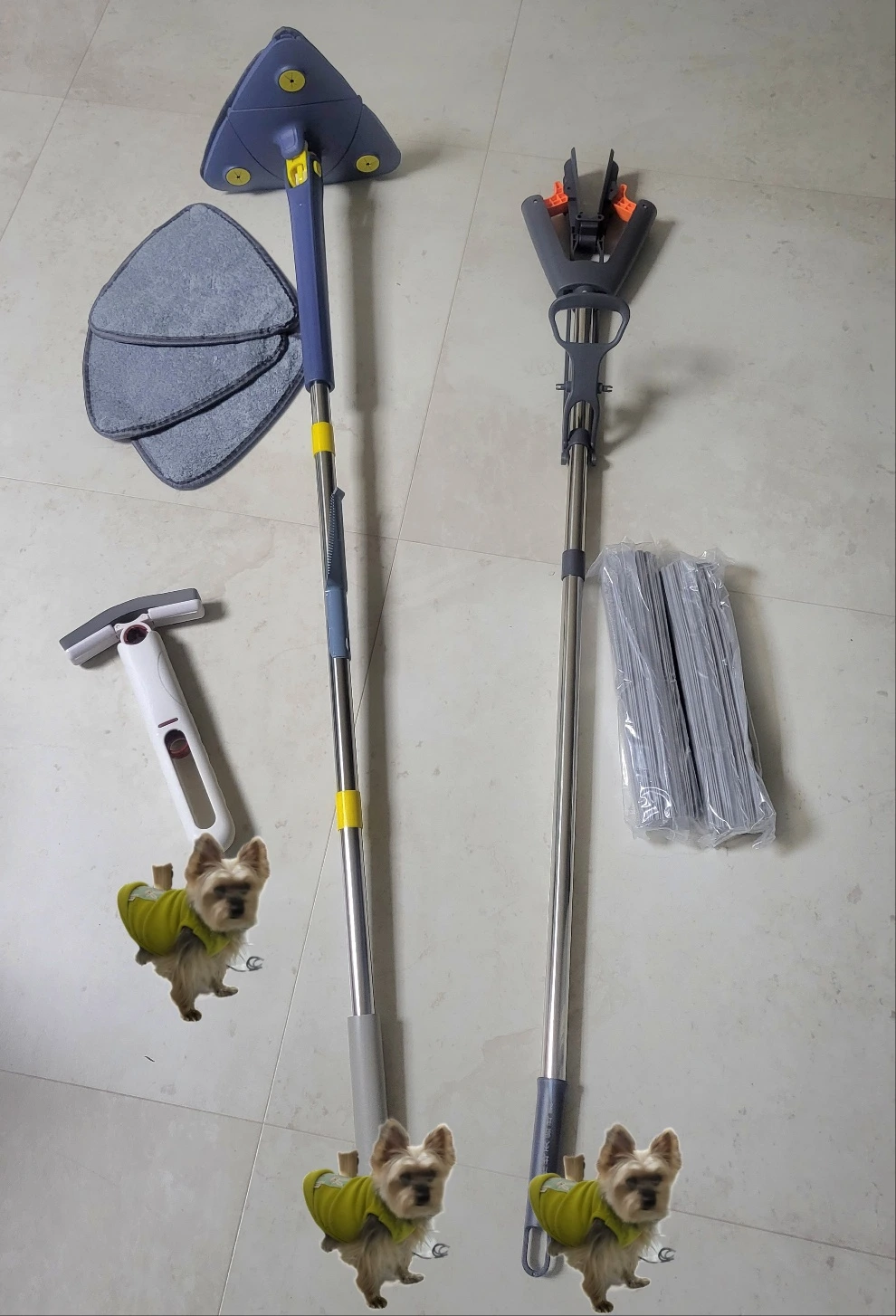 우리가 가장 자주 쓰는 것은 손잡이를 당겨 세척하는 기다란 스펀지 걸레다.(맨 오른쪽 제품) 흡수력도 빠르고 세척도 쉽다. 무엇보다 손에 아무것도 묻히지 않고 처리할 수 있어 좋다. 배변 패드에 쉬를 하지 않으니 배변 패드 구입 비용이 줄었고 쓰레기도 만들지 않는다고 좋게 생각하기로 했다.