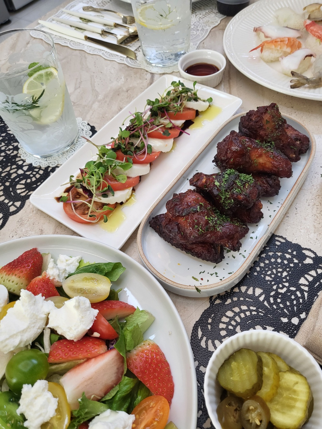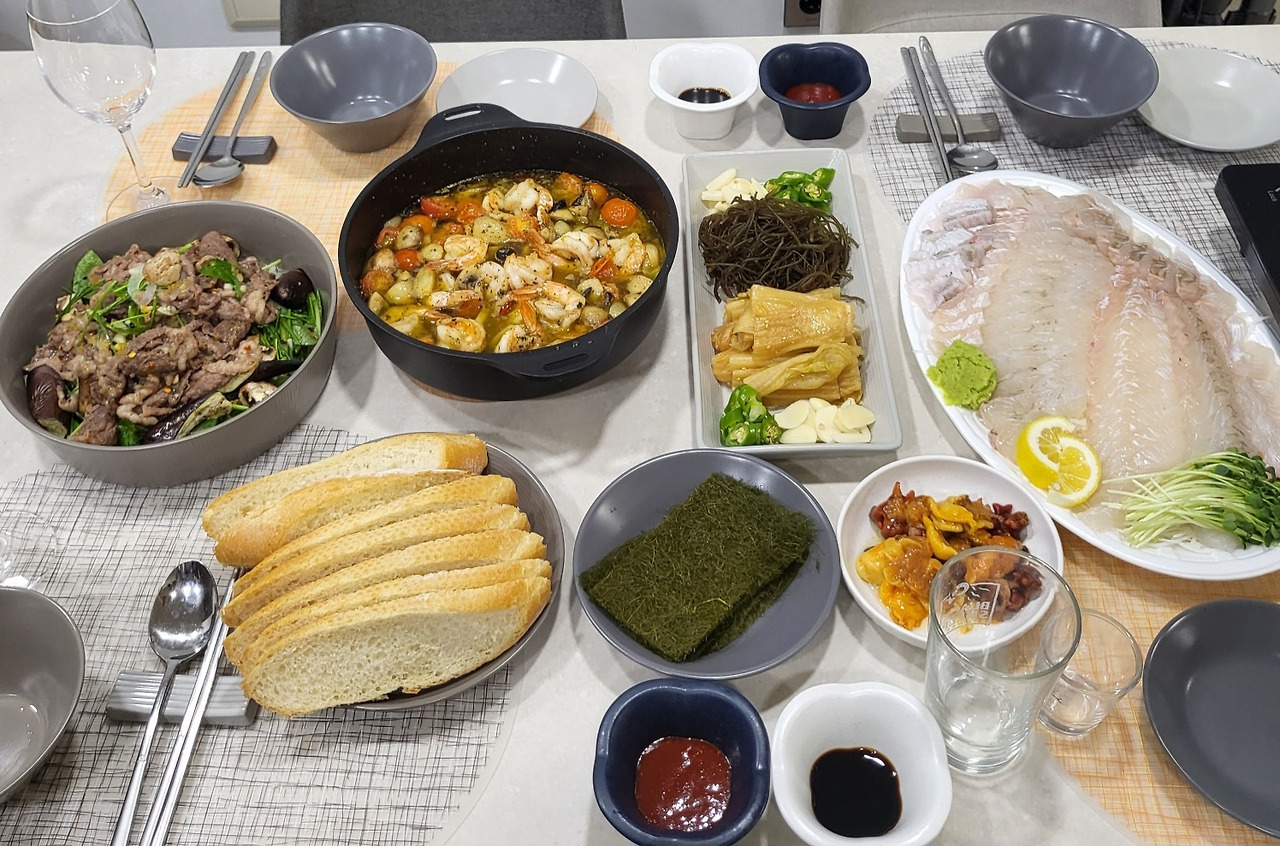 지난 번에 우리들이 방문하면서 힘들게 차리지 말고 배달음식을 먹자고 했는데 또 한 상을 차려 놓았다. 마침 근무하고 온 날이라 음식할 시간이 없어서 마트에서 사 온 것들로 차렸다고 하는데 그 '사 온 것들'을 식탁에 올린 솜씨에 감탄했다.