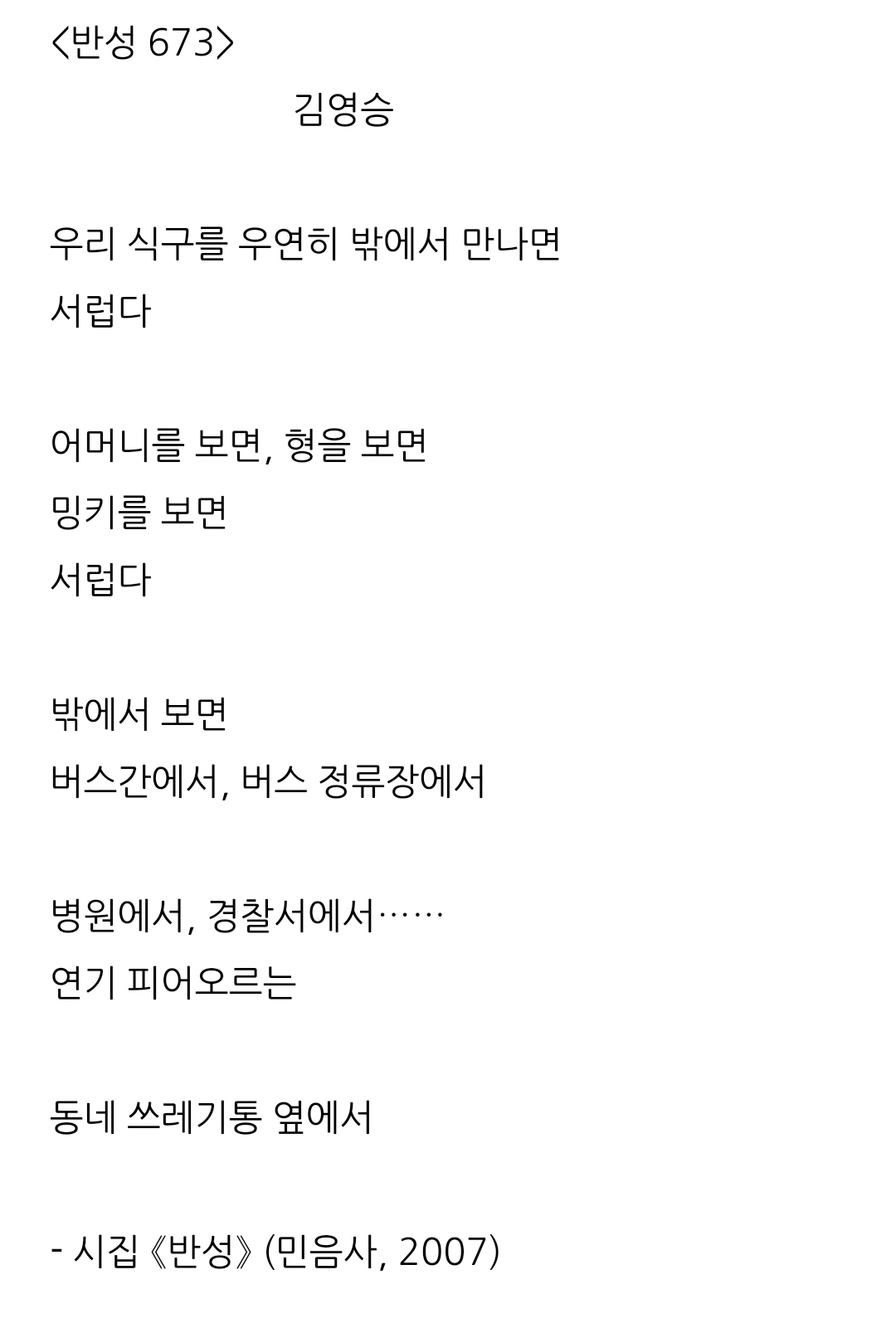 알게 된 시인 중 김영승이 있다. 그의 시는 '반성'이라는 제목에 번호를 붙인 게 많았는데 읽는 순간 마음에