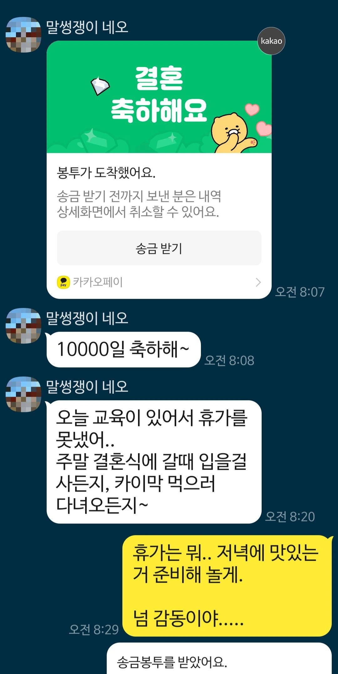 -근데 만 일이라 했더니 남편이 용돈을 크게 보내주더라.
