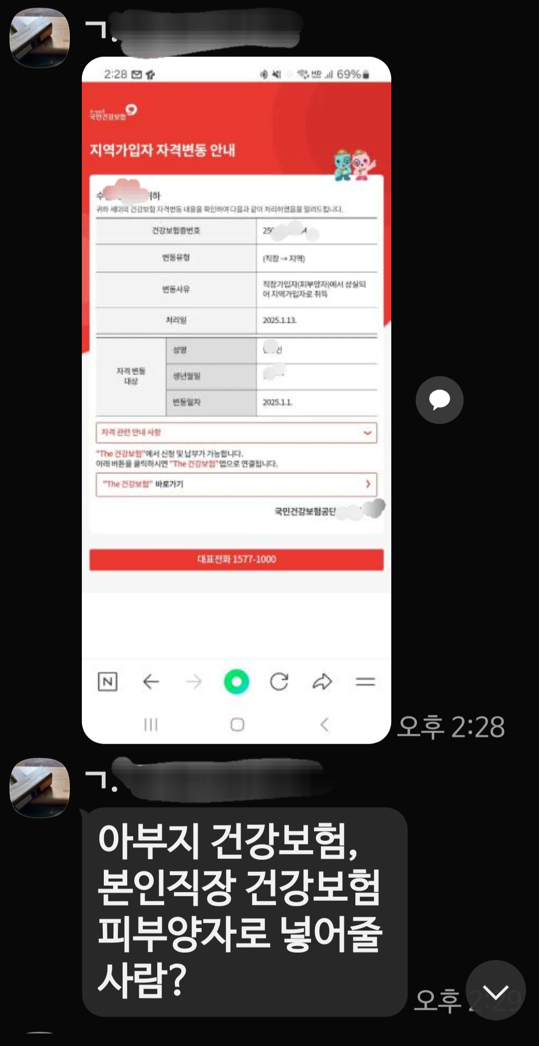 퇴직 처리가 되고 딱 보름 만에 건강보험공단에서 지역가입자로 자격이 변동된다는 알림이 왔다. 굳이 어느 한 녀석을 콕 집어 부탁하기도 그래서 선착순으로 지원자를 구하기로 했다.