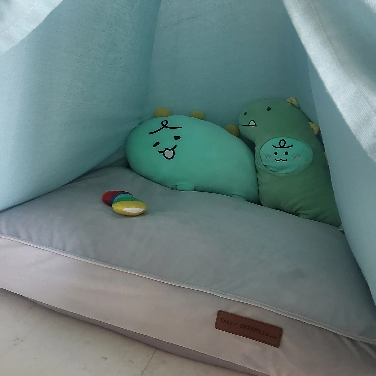 새로 꾸민 개집에는 사용해 줄 주인보다 먼저, 폭신한 방석과 삑삑이 장난감이 자리를 잡았다. 친구가 입양 축하선물로 보내 준 군밤이용 당근 케이크도 있다.
