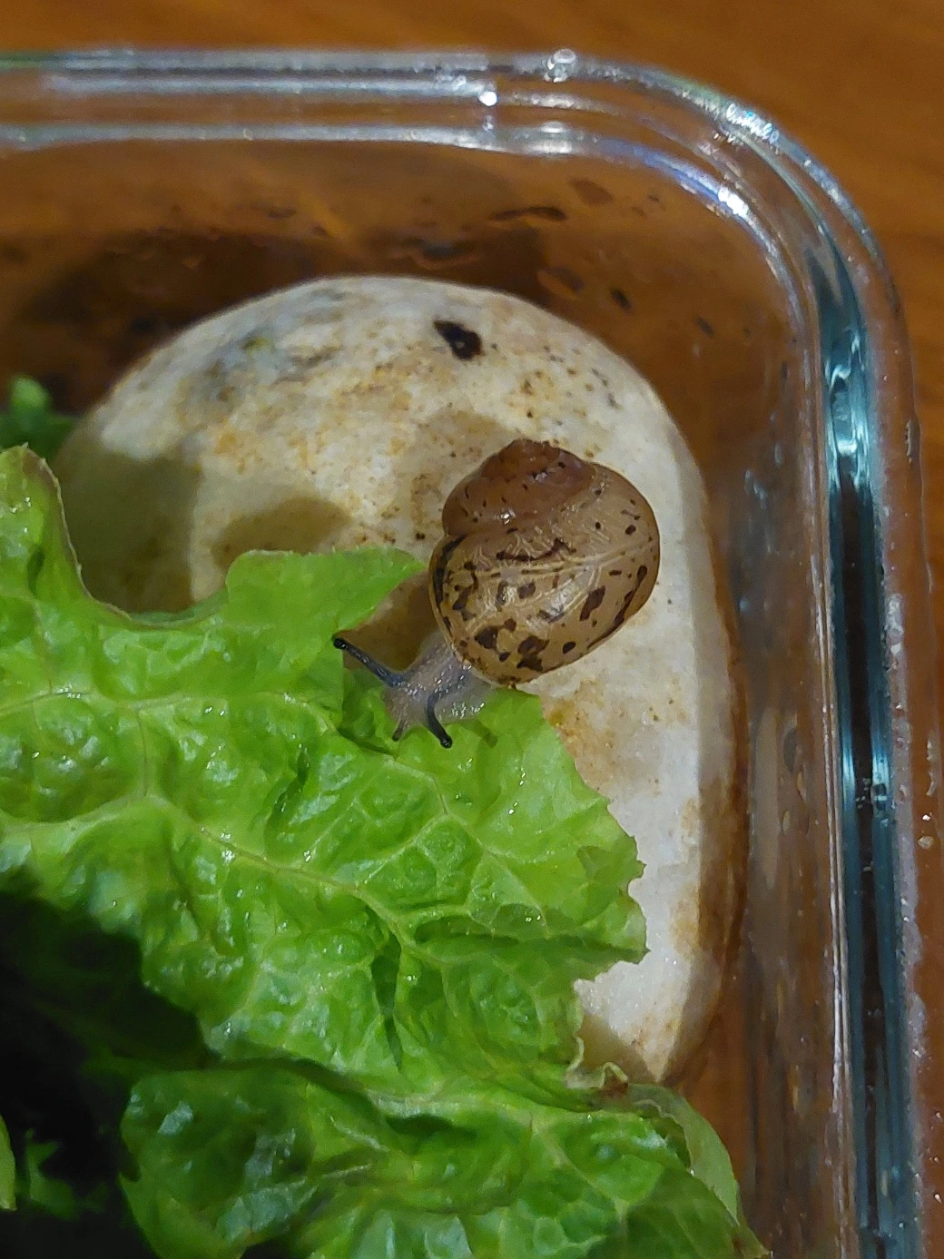 달팽이는 주변에 수분이 부족하면 막을 치고 껍질 안에 숨어서 버틴다. 유리용기 안이 건조하지 않게 가끔 분무기로 물을 뿌렸다.