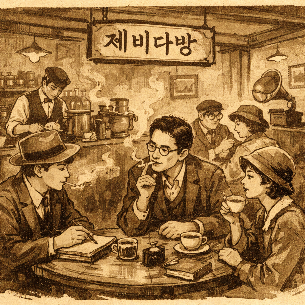 해외 공사와 궁궐이라는 공간에서 호텔로 넘어온 커피 문화는 구한말을 그린 드라마 <미스터 선샤인>에 엿보인다. 그리고 1930년대를 배경으로 한 영화 <모던보이>에서는 커피가 독립된 형태의 카페로 나와서 사람들과 한층 가까워져 있는 모습을 볼 수 있다. 우리 커피사를 말할 때 '제비 다방'은 빠지지 않는다. 이상의 단편 소설 <날개> 속 인물의 모티프로 추측되는 이상과 그 아내가 함께 운영했다는 '제비'는 그 시절의 문인과 예술가들이 모여든 공간으로 유명하다.