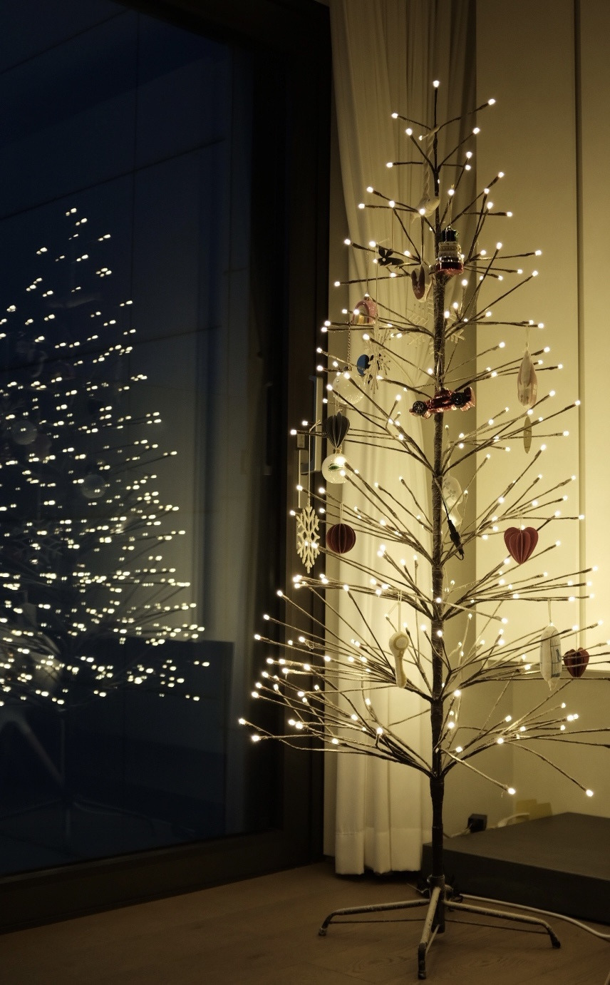 비슷비슷한 초록 나무가 아닌 마음에 딱 드는 크리스마스트리를 갖고 싶던 선배가 인테리어 편집샵에서 보자마자 바로 구입했다고 한다. 전구가 달려 있는 나무 장식은 오너먼트를 바꿔 달면 그 어떤 기념일 연출도 가능하다. 흔히 볼 수 없는 독특하면서도 세련된 크리스마스트리이다.
