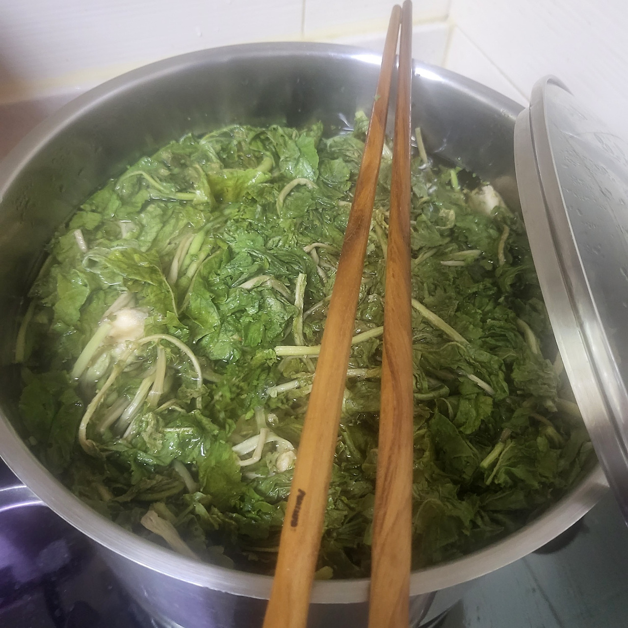 30분 타이머를 맞춰 놓고 다음 과정을 찾아보니 삶은 후엔 그 상태 그대로 뚜껑을 덮고 3시간 정도 두라고 한다. 그러고 나서 깨끗하게 서너 번 헹궈서 꼭 짜고 다시 겉줄기의 껍질을 벗긴다.
