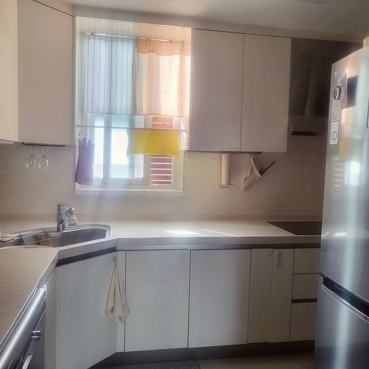 앞으로 길쭉한 ㄱ자 구조라서 한눈에 주방 전체가 들어오지는 않는다.