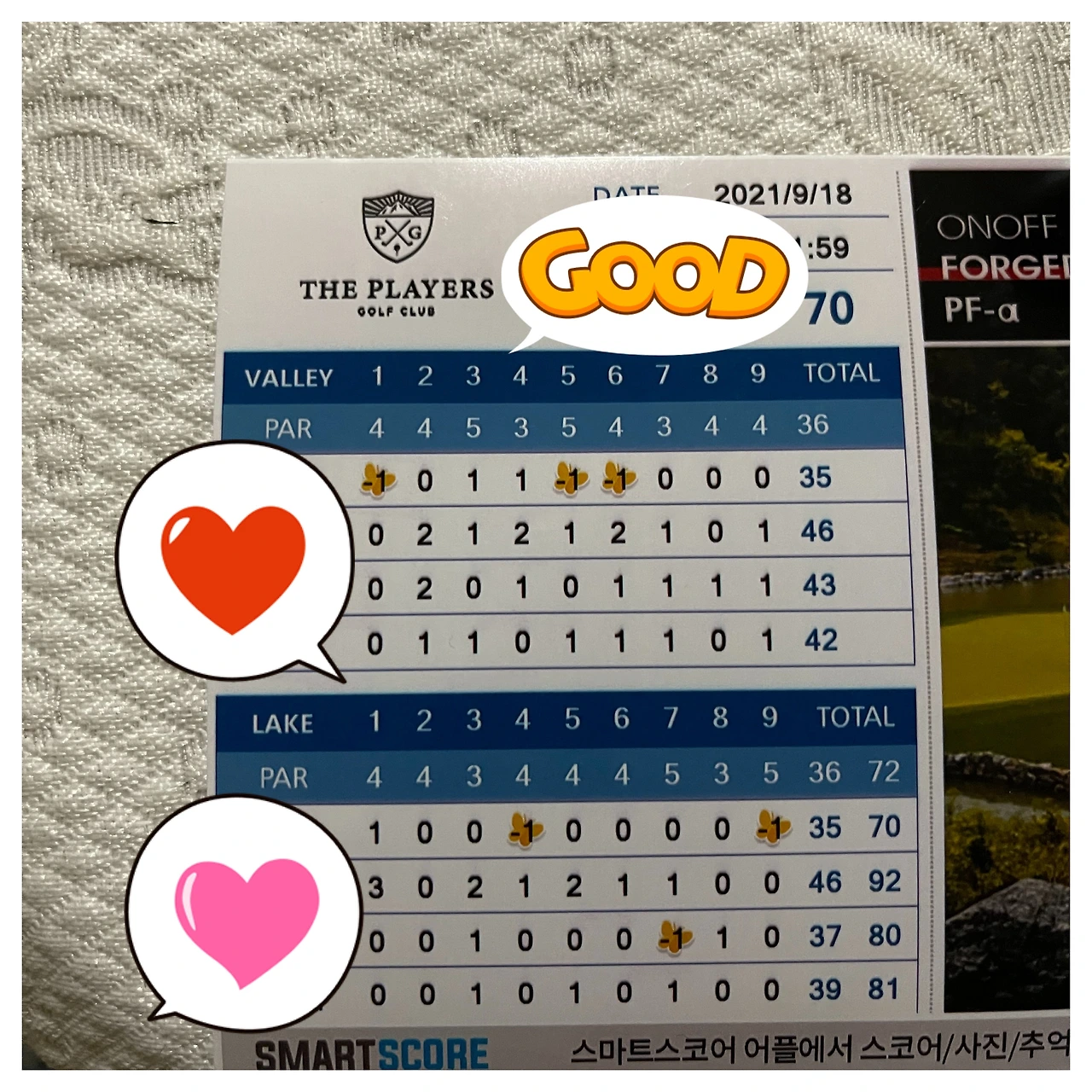골프에서 가진 가장 큰 숙제를 풀었네요. 올해 75타로 기존 라베 78타를 깬 지 수개월 만에 또 5타를 줄여 70타를 기록하니 얼떨떨하기도 합니다. 아마도 수년 뒤에나 이룰 수 있는 그런, 멀리 있는 꿈같은 거라 생각해 오늘 라운드 전에 언더파를 쳐야겠다는 생각할 수도 없었습니다. 그저 한 홀 한 홀, 더 작게는 한 타 한 타 최선을 다하려고 노력했을 뿐입니다. 물론 언더파 혹은 라베를 의식하면서 위기도 있었습니다만, 지금의 샷에 집중하다 보면 스코어는 따라올 뿐이라는 걸 다시 한번 깨닫게 되네요. 좋은 사람들과 즐겁게, 웃으면서 라운드 했을 뿐인데 꿈에 그리던 언더파 스코어를 기록하니 너무 행복하고 뿌듯하네요. 좋은 기억을 가지고 이제 원래 살던 싱가포르로 돌아갈 수 있을 것 같습니다. 그저 감사하고 행복합니다.