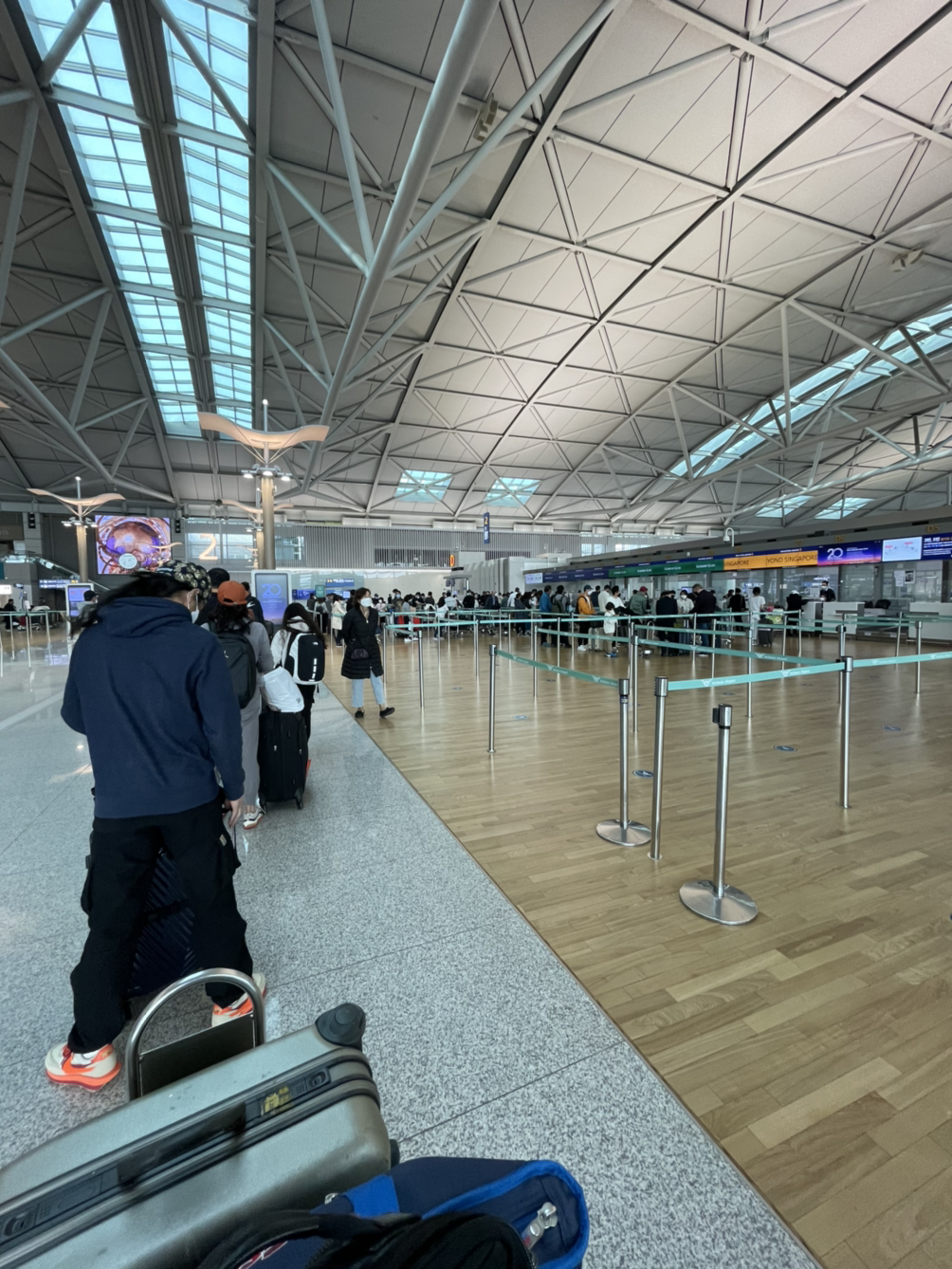 5. 확실히 여행자 수가 늘었습니다. 11월 15일 VTL 시행 전에 한국에 입국했을 때에는 비행기 절반 정도가 찼다면, 이번에는 70% 정도는 찬 느낌입니다. 그리고 체크인 시간이 오래 걸렸습니다. 한국으로 입국할 때는 체크인 카운터에 거의 아무도 없었는데, 이번에는 거의 1시간을 기다려 체크인을 하고 출국장에 들어갈 수 있었습니다. 체크인 카운터에서는 VTP (Vaccinated Travel Pass), PCR Test 결과지를 확인합니다. 이와 함께 여권과 제 EP 카드를 건넸습니다.