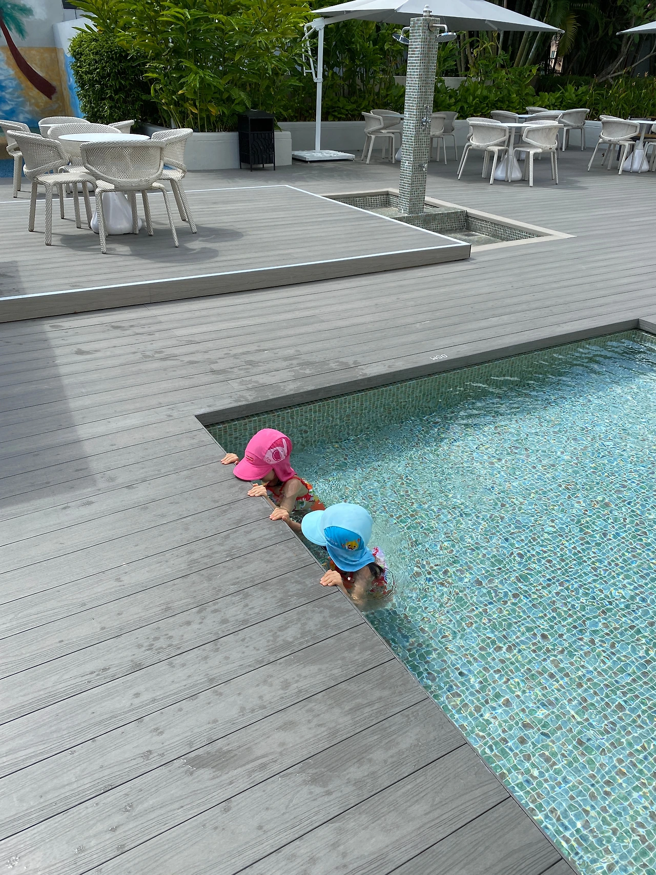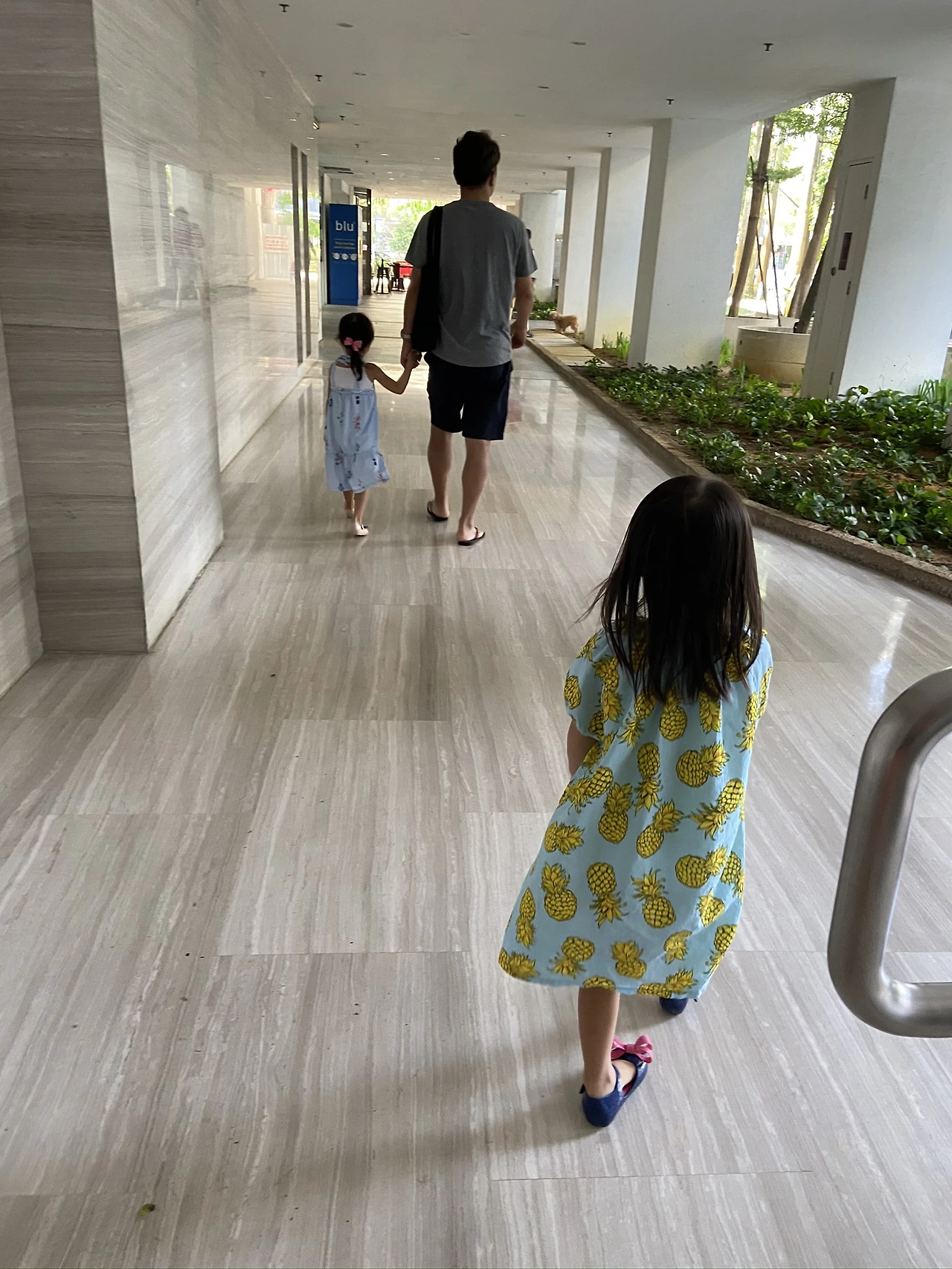 이렇게 아침 시간을 보내면 수영장에 갈 시간이다. 수영복으로 갈아입히고 선크림을 듬뿍 발라준다. 여기도 요즘 날씨가 그렇게 덥지는 않아 오전 일찍 수영하는 건 조금 춥다. 11시쯤 되어 나가야 아이들이 춥지 않다. 그렇게 한두 시간 수영을 하면 아이들 밥시간이다. 처음엔 근처 호커 센터에 가서 밥을 먹여봤는데, 어른이 먹기엔 괜찮아도 우리 아이들 먹이긴 조금 부실한 거 같아 그랩 푸드로 조금 더 나은 식당에서 밥을 시켜주던가 그것도 여의치 않으면 내가 차려준다. 점심까지 먹였으면 이제 아이들이 자유롭게 놀 시간이다. 스스로 퍼즐을 맞추기도 하고 나와 같이 레고를 만들기도 한다. 이렇게 시간을 보내면 한 4시 정도 되는데 뭐 할지 고민을 할 시간이다. 다시 수영장을 가기도 하고, 레지던스 놀이방을 가기도 한다.