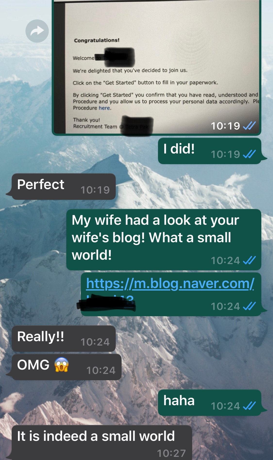 오늘 IPA를 받고 나서 바로 같은 콘도, 같은 동에 사는 인도 출신 채용 담당자 A와 콘도 수영장에서 만나 잠시 이야기를 나눴다. 재미있는 건 이 A의 와이프가 한국 사람인데, 우리 와이프가 싱가포르 관련 블로그를 찾아보다 알게 된 사람이라는 거다. 정말 세상이 좁다며 아래처럼 A에게 메시지를 보냈다.