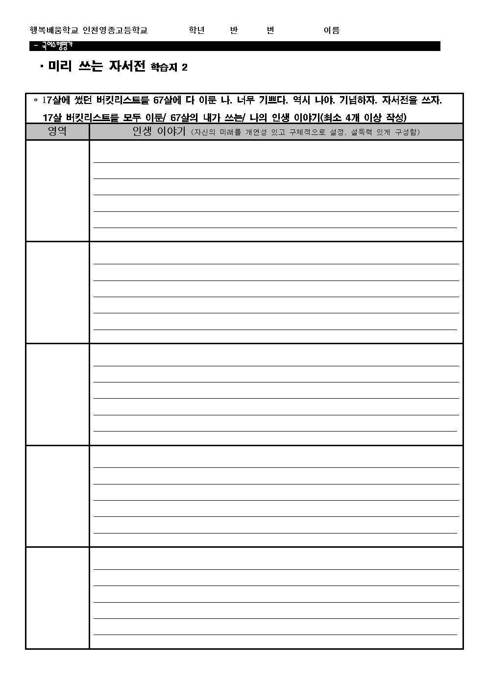 총평 : 3월 초에 했습니다. 첫만남에 저를 1시간 동안 5장의 사진으로 소개하는 시간을 마친 후에, 바로 시작했습니다. 즐거웠습니다. 학생들이 엄청나게 초 집중 했거든요. 잘하는 학생 못하는 학생 할 거 없이 모든 학생이 몰입해서 진지하게 고민하여 빙긋이 웃으며 엄청난 글들을 써 내려갔습니다. 담임샘께 슬쩍 보여드리기도 했습니다. 생각보다, 국어교과가 심지어 담임샘보다도 학생들의 내면과 욕망과 상처에 대해 섬세하게 살필 수 있음을 확인하는 수업이기도 했습니다. 3시간 동안 진행했습니다. 그렇게 개학 후 1주일을 벌었습니다. 그 1주일 동안 동료샘과 한 학기 수업을 기획했습니다. 첫 주 수업이 확실하니 남은 시간이 더 크게 여유로웠습니다. 그리고 무엇보다, 이 수업이 크게 도움이 되었다는 말을 학생들로부터 들었습니다. 학생들의 글을 읽은 담임샘들로부터도 들었습니다. 물론 가장 큰 도움을 받은 것은 저 자신이었습니다. 학생을 파악하는 데에, 학생을 이해하는 데에, 학생을 설득하고 칭찬하고 격려하는 데에 크게 도움이 되었거든요. 매력적인 수업입니다. 추천합니다.