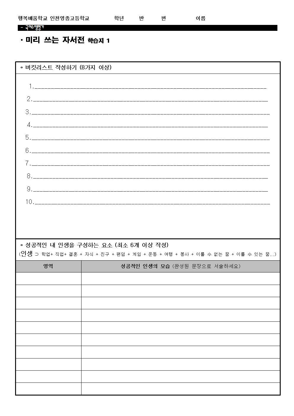 성공했네. 참 쉽게 듣는 말인데, 대체 뭘 기준으로 삼는 것일까요? 궁금했습니다. 그리고 알고 싶었습니다. 우리 학생들은 인생의 어느 부분에 정성을 쏟고 싶어 하는지, 그 부분의 성공 기준을 무엇으로 삼을지. 돈이나 이름, 막연하게 그런 거 말고, 좀 더 구체적으로, 내 손에 꼭 쥐고 싶다면, 정말 더 구체적으로, 대체 그렇게 손에 쥐고 싶어 하는 게 어떤 실체를 갖고 있는 지 상상해 보았으면 했습니다. 그래서 어느 정도면 만족할 수 있는지, 가슴 펴고 당당하게 내 인생 성공했다고 말할 수 있는지 구체적으로 살펴보게 했습니다. 영역을 나누어 각각에 맞게 구체적으로. 구체적인 꿈만 이루어집니다. 막연한 꿈은 언제나 막연할 뿐입니다. 구체적으로 상상해야 구체적으로 이루어집니다.