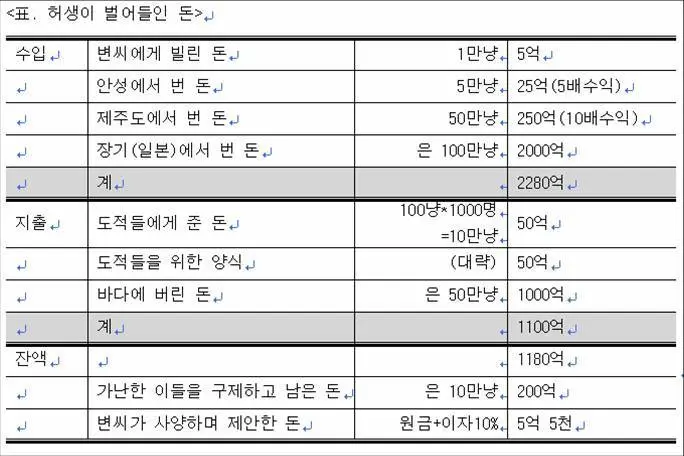 상평통보 1냥은 오늘날 돈의 가치로 따지면 대략 5만원, 은 1냥은 상평통보 4냥이므로 20만원. 이것에 근거해서 허생이 벌어들인 돈1)을 정리하면 다음과 같다.