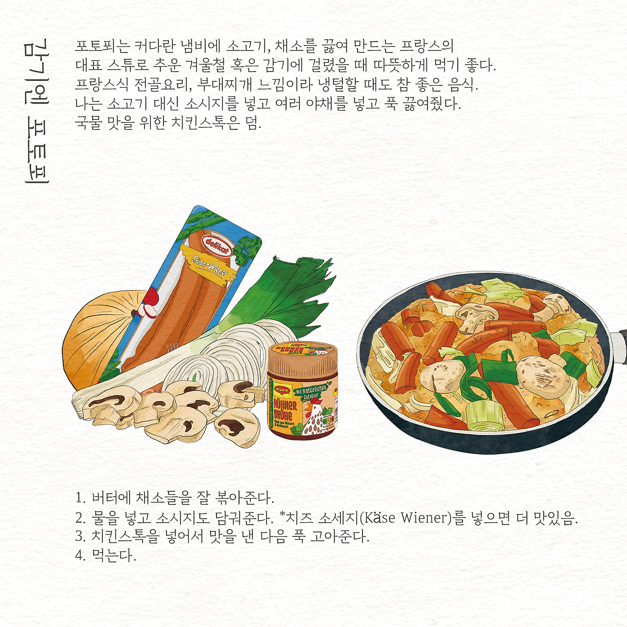 그럴 땐 독일 마트에서 쉽게 구할 수 있는 재료들로 유럽식, 아니 프랑스식 찌개를 끓여 먹는다.