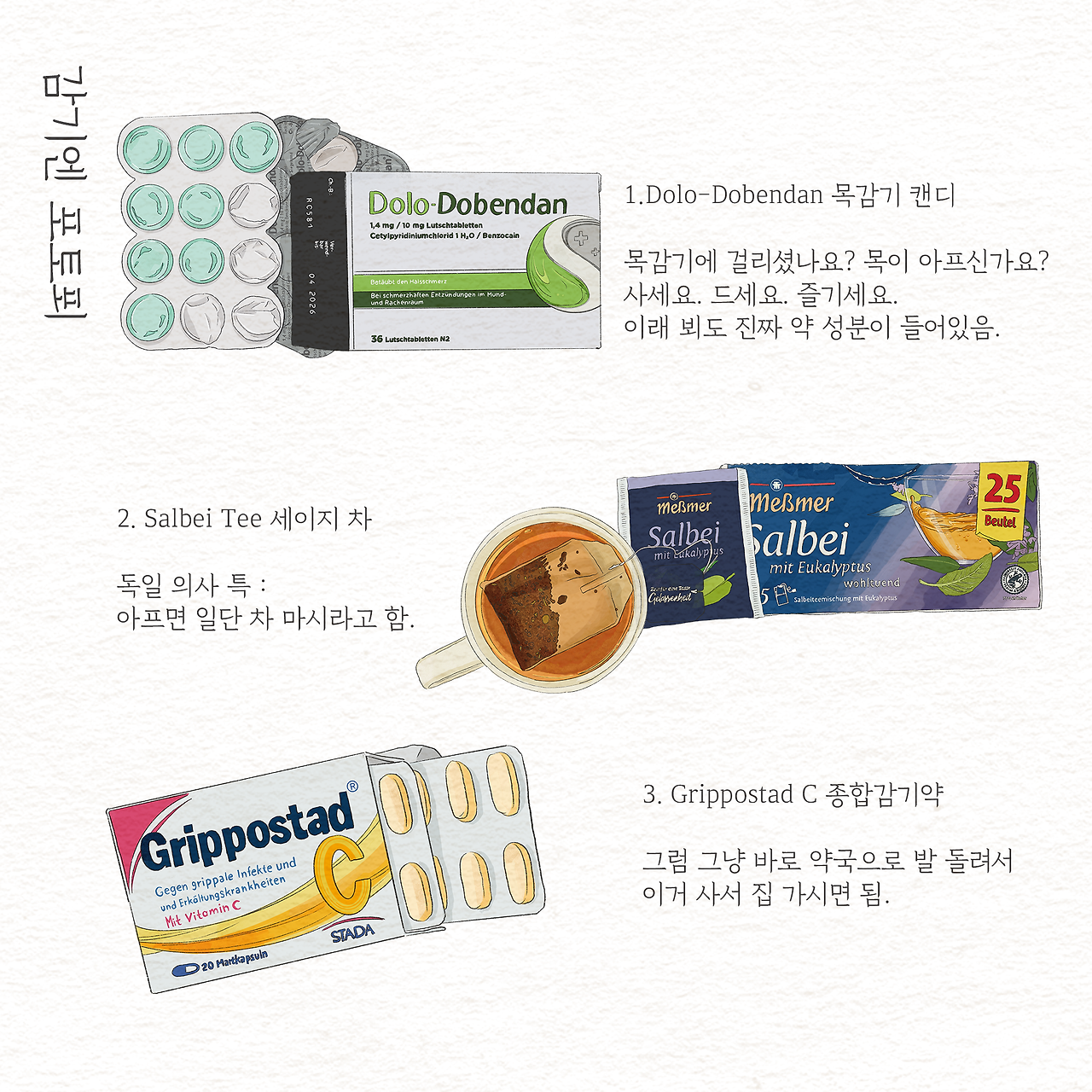독일 살면서 의사는 못 믿어도 약국은 믿을 수 있게 되었다. 생각보다 괜찮은 것들이 많은 게 아플 때 괜히 약국쇼핑을 하게 돼서 지갑이 위험해질 때가 종종 있다. Dolo Dobendan이라는 목캔디는 항상 집에 구비해 놓는다. 실제 약 성분이 들어있어서 먹으면 혀가 약간 아릿한 게 느껴지는데 그게 또 건강해지는 느낌을 줄 뿐만 아니라 목 통증도 완화시켜 준다. 그렇다고 일반 사탕처럼 여러 개씩 까먹으면 당연히 안된다... 이것도 약이기 때문에.