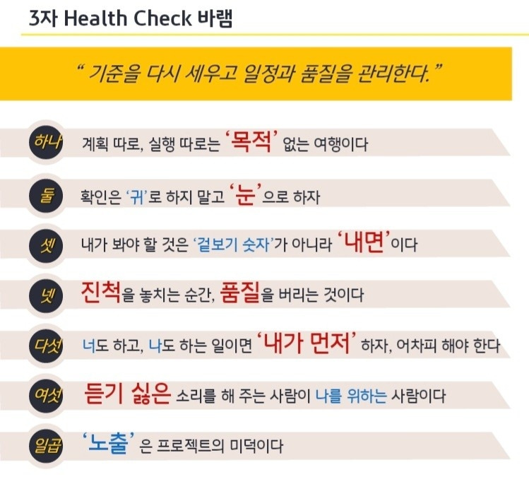 프로젝트 진단 시, 건강한 프로젝트를 위해 집요하게 파고드는 점이 '계획점검'과 '계획대로 했느냐'이다. '사람'이 바뀌지 않으면 진정한 문제해결은 되지 않는다.